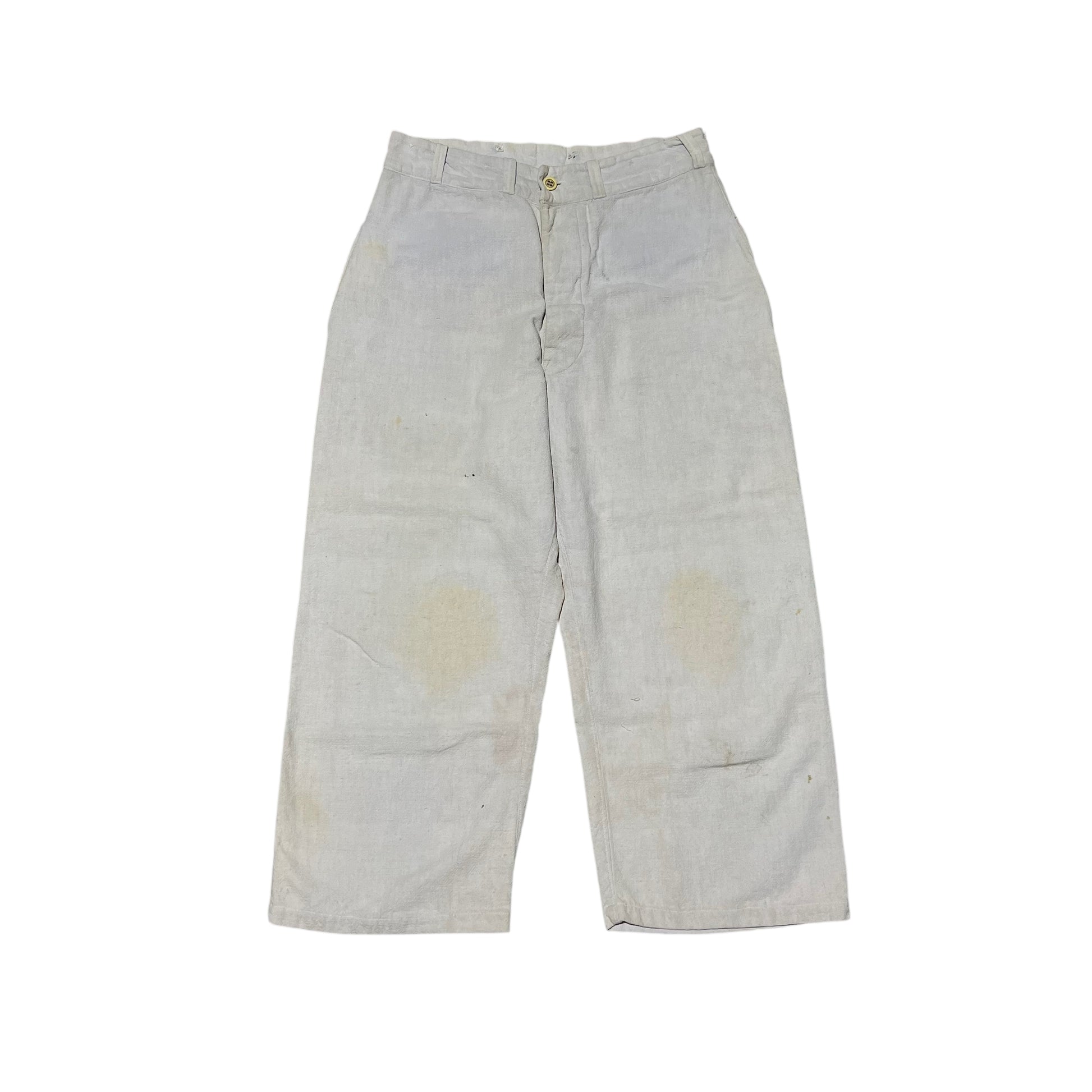 1930s 1940s Feed sack ration button fly sun faded light blue work pants (32w)