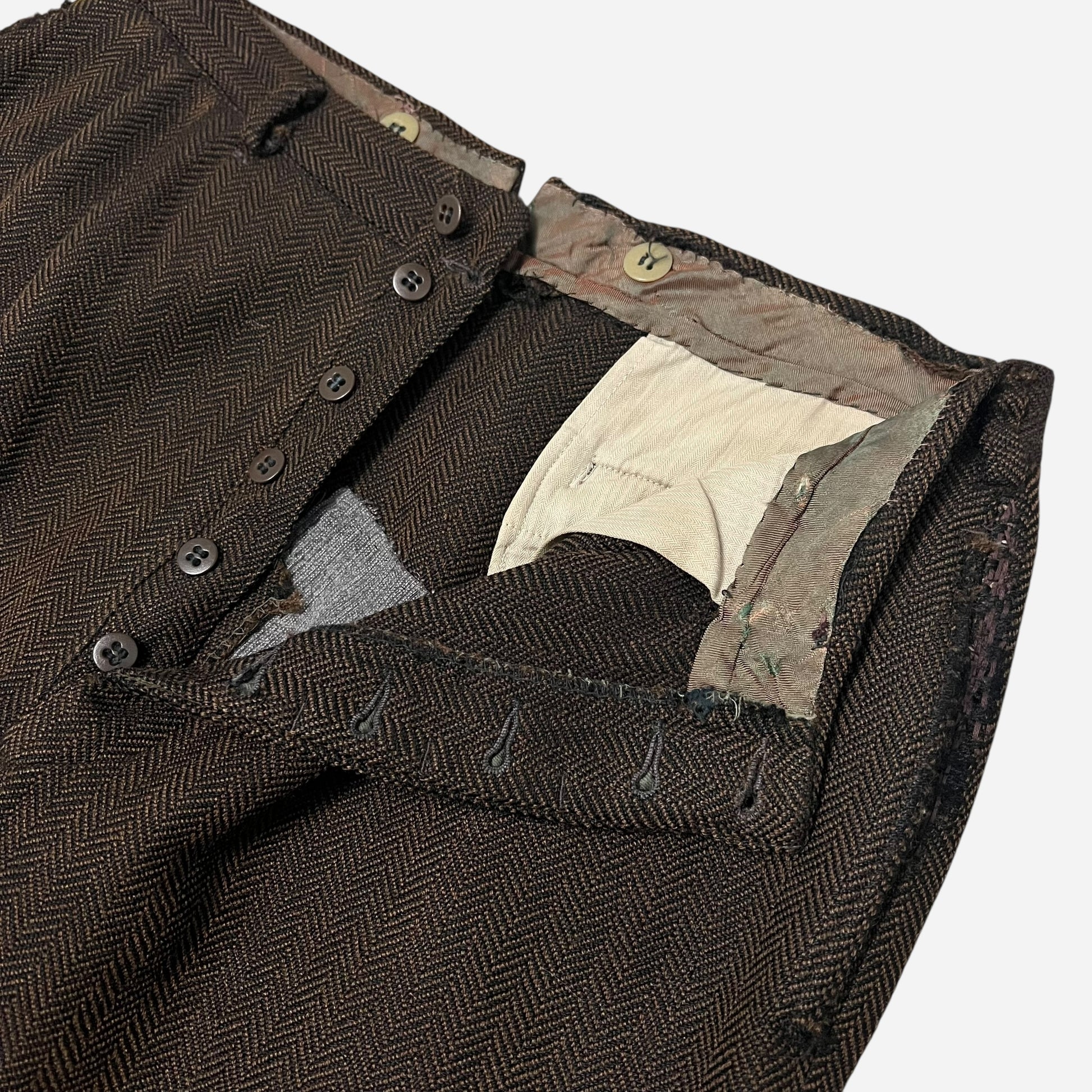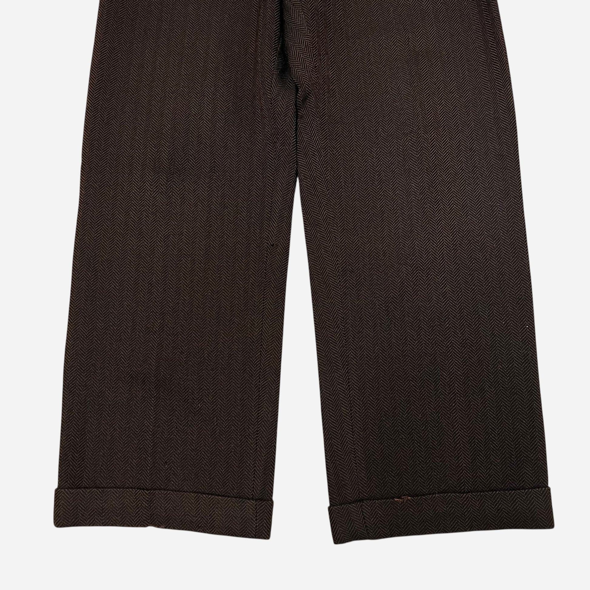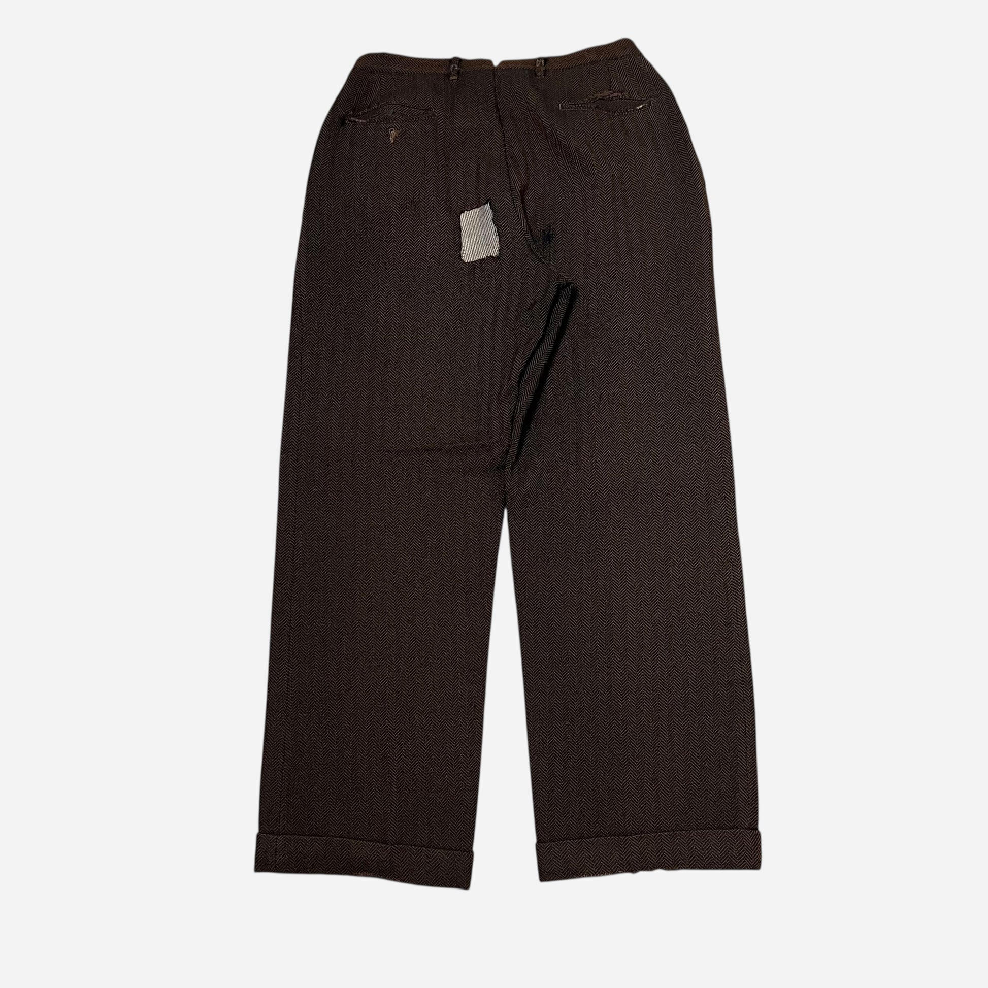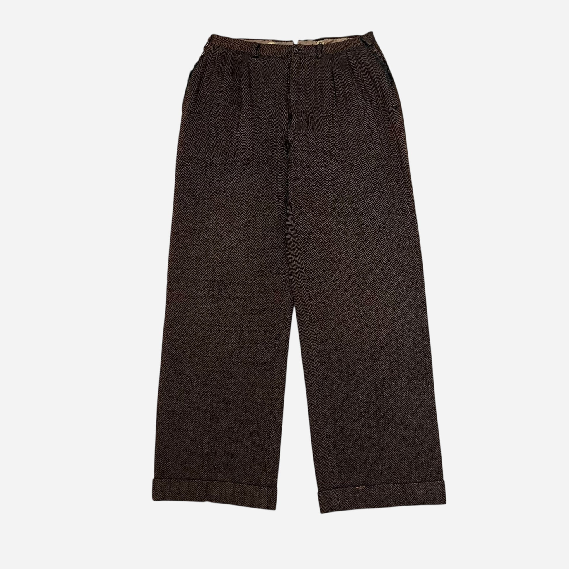 1930s Brown tweed herringbone button fly Stifel repaired pleated work pants (31w)