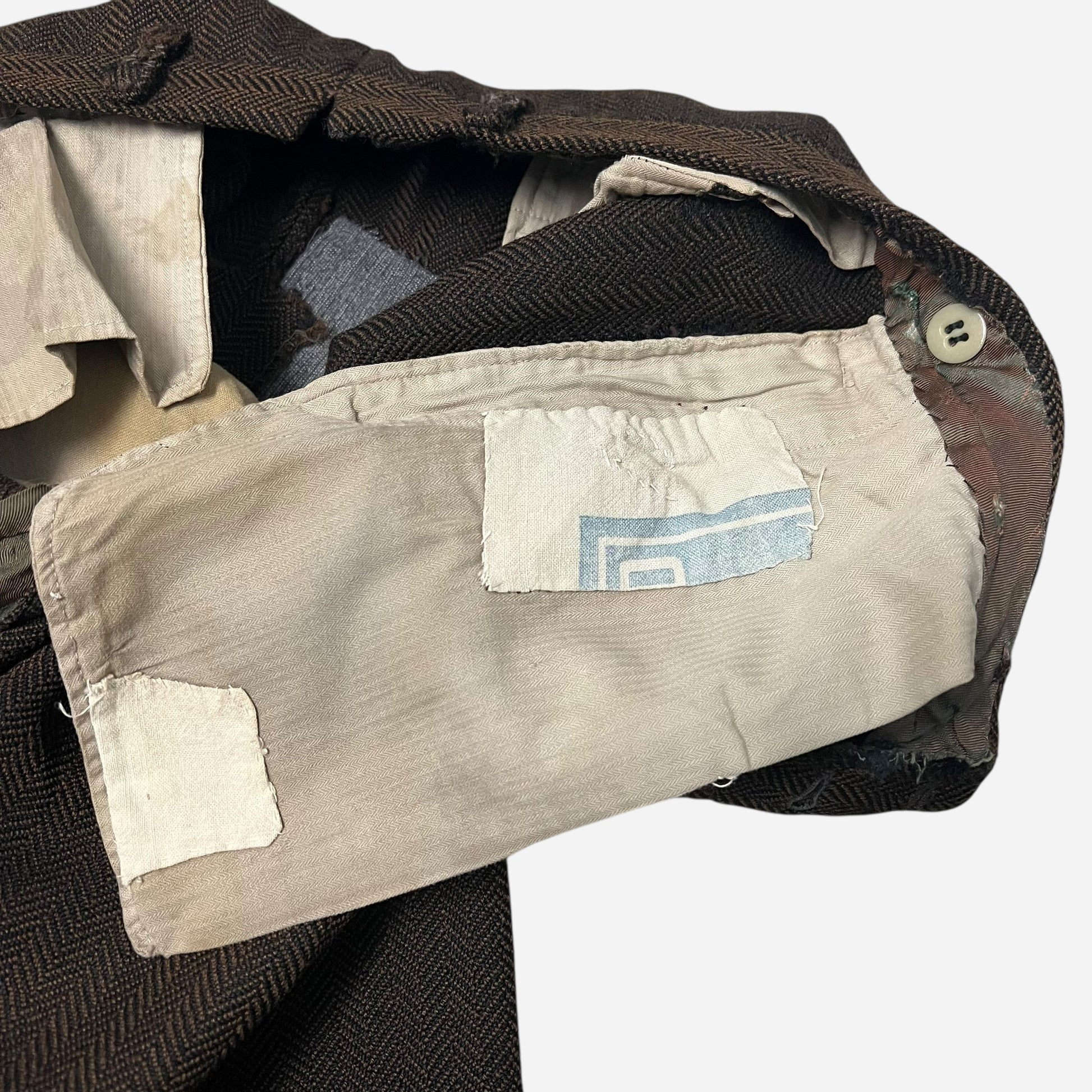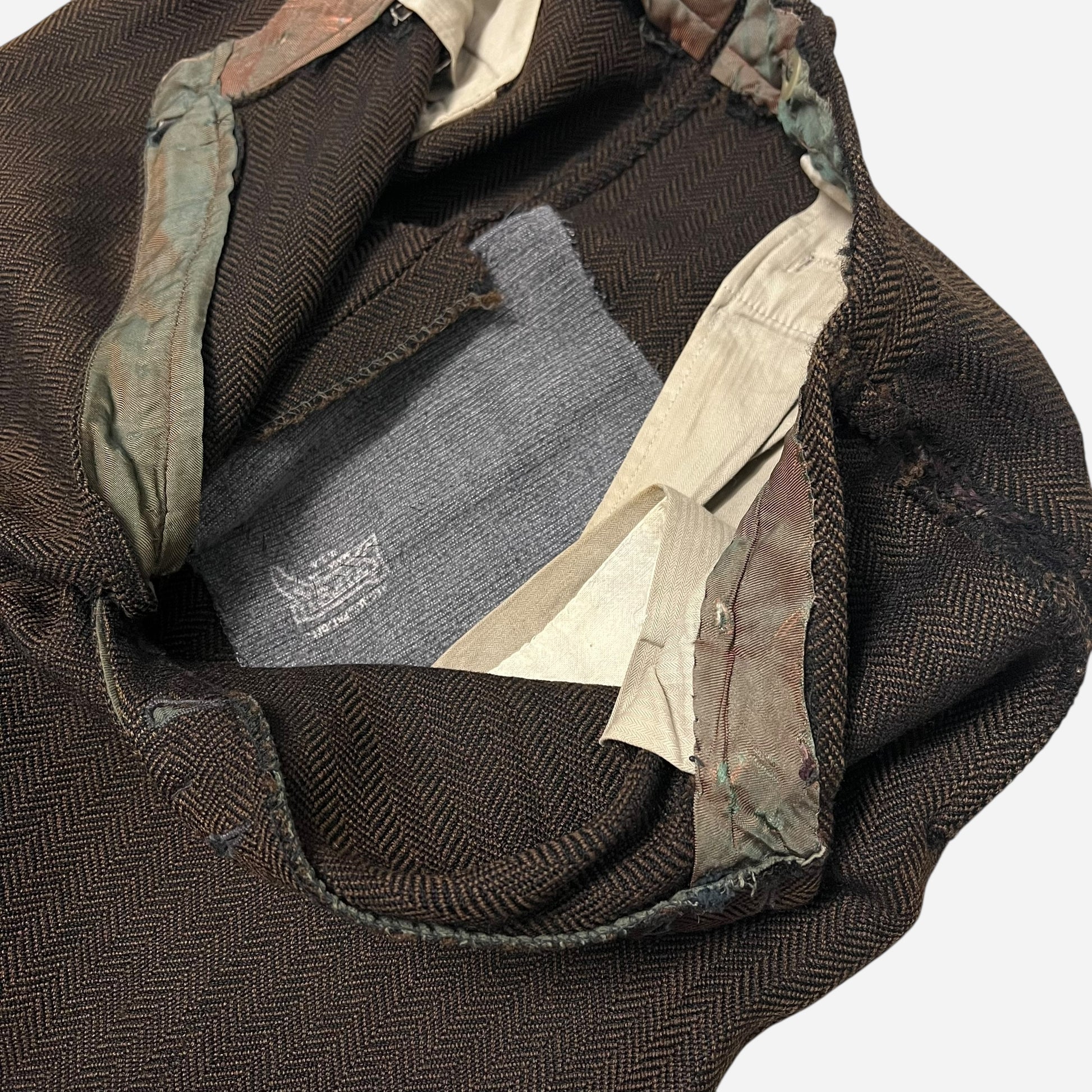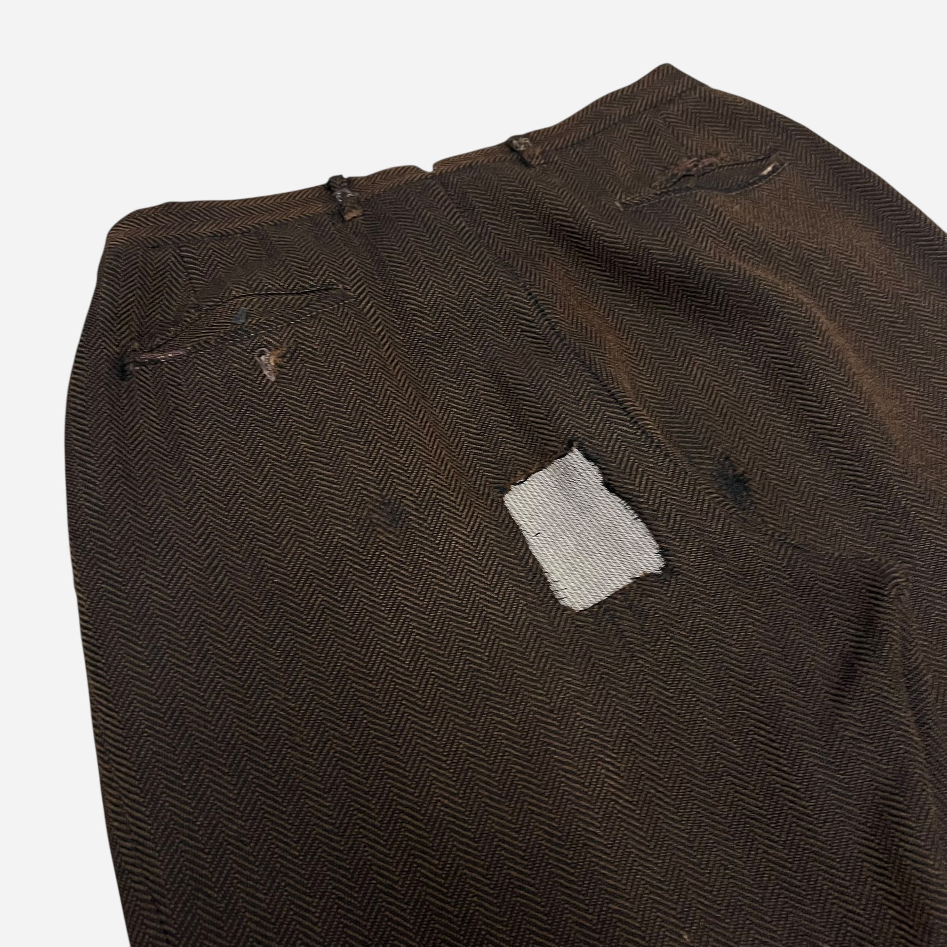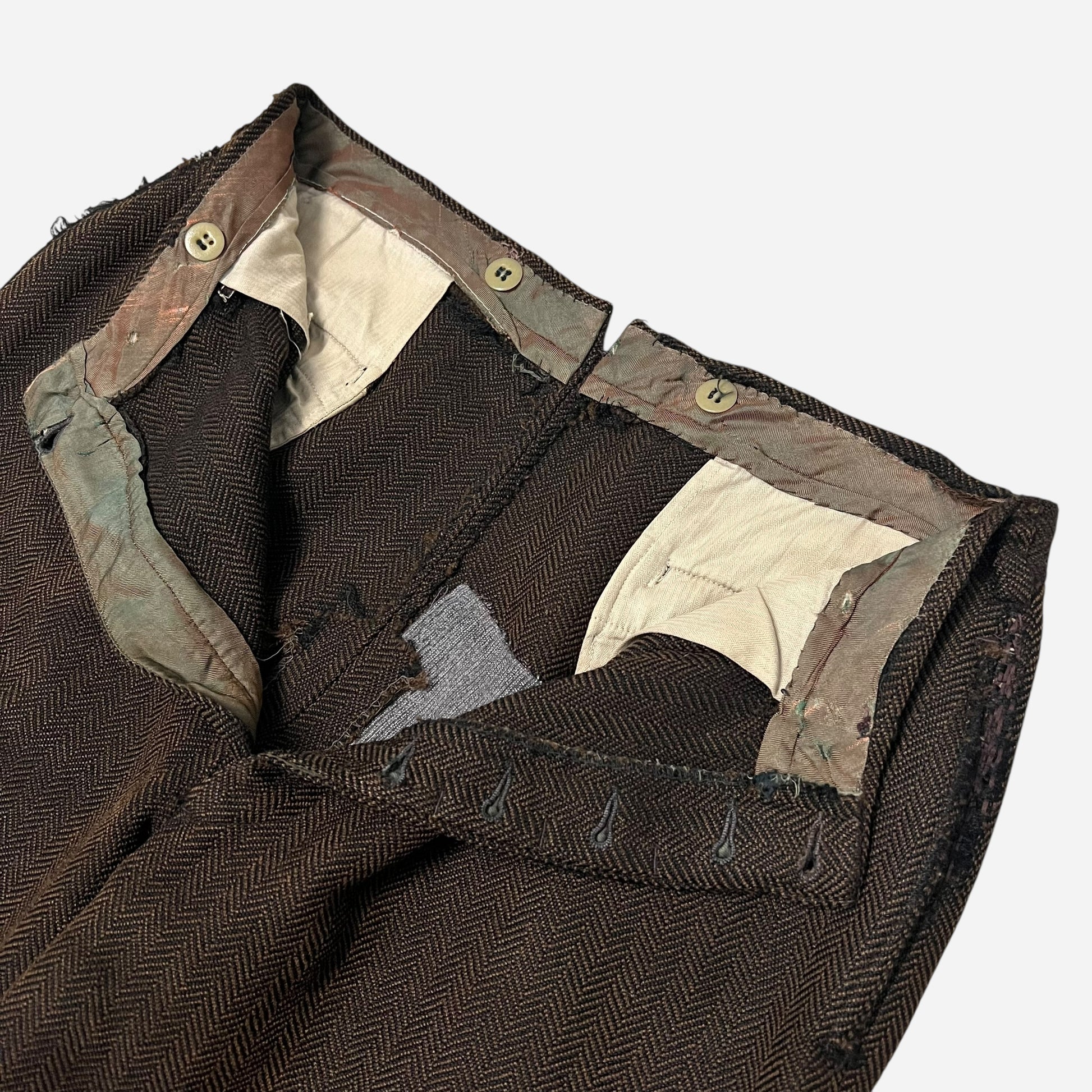 1930s Brown tweed herringbone button fly Stifel repaired pleated work pants (31w)