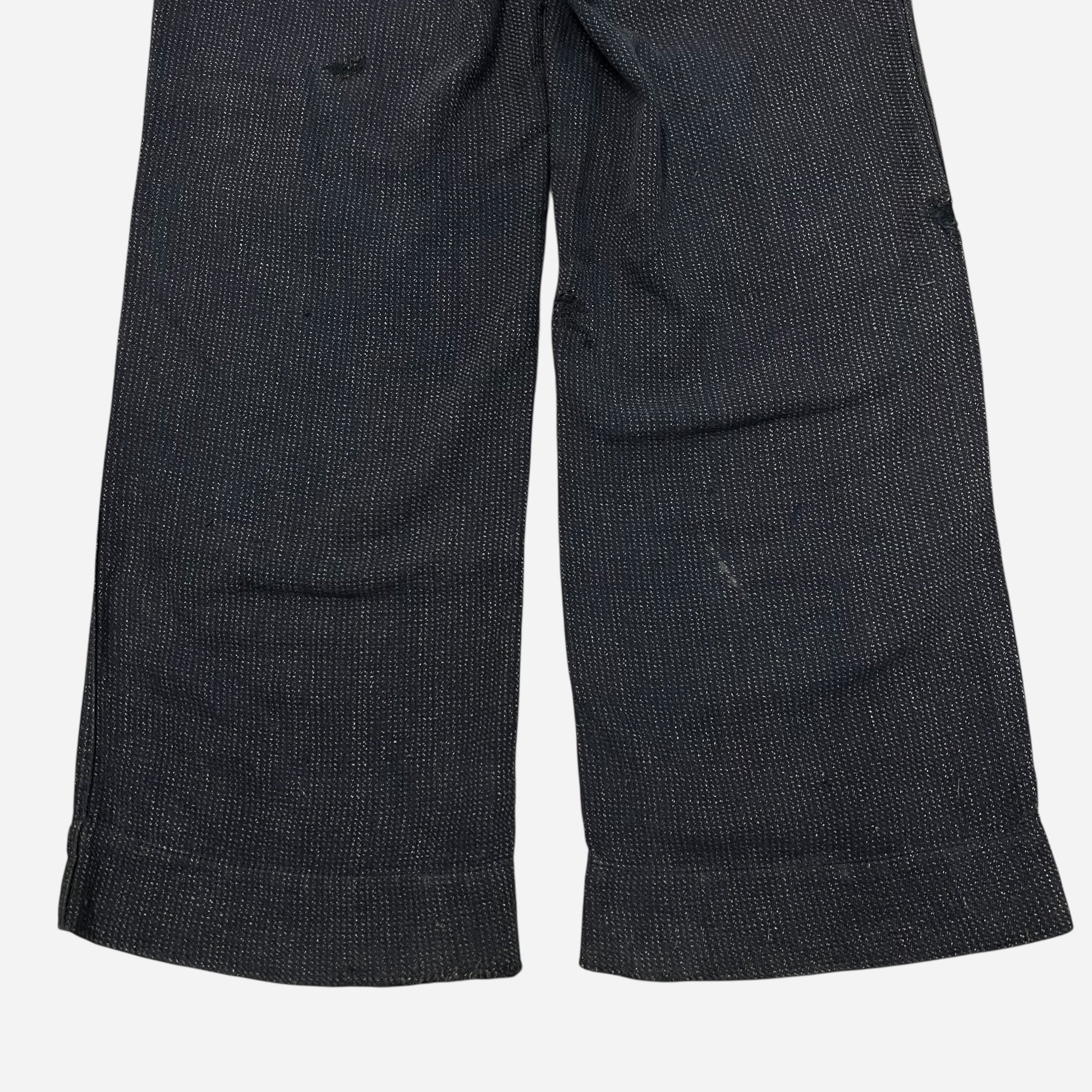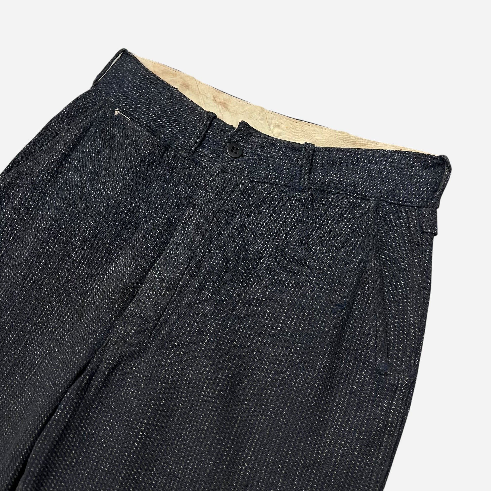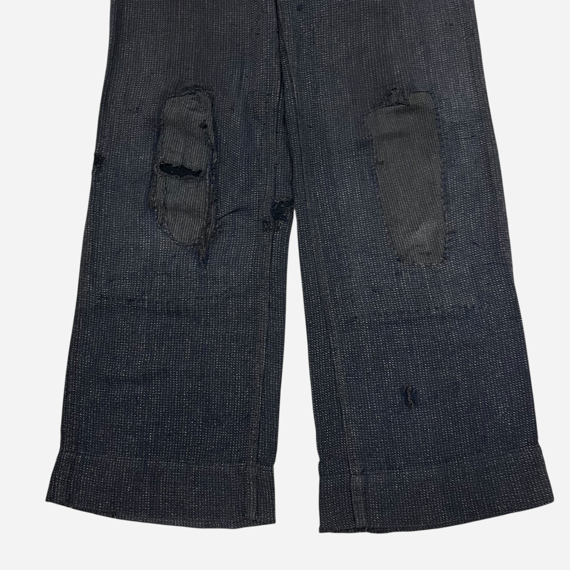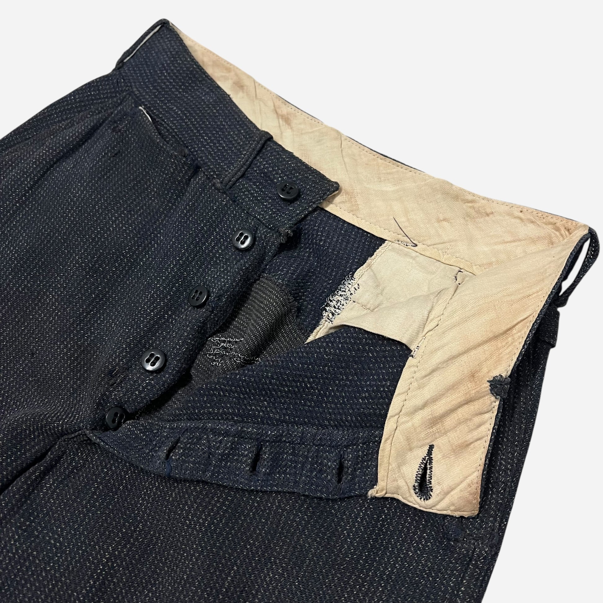 1930s Navy/black side clasp cotton salt & pepper repaired button fly work pants (27w)