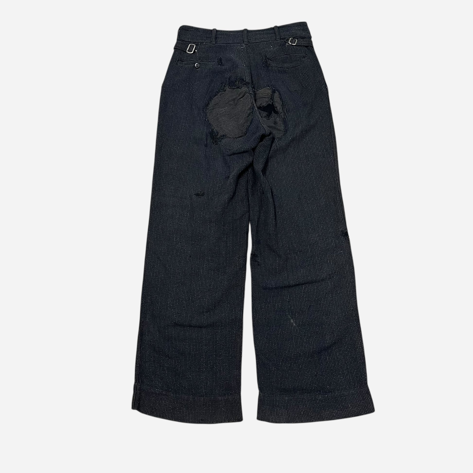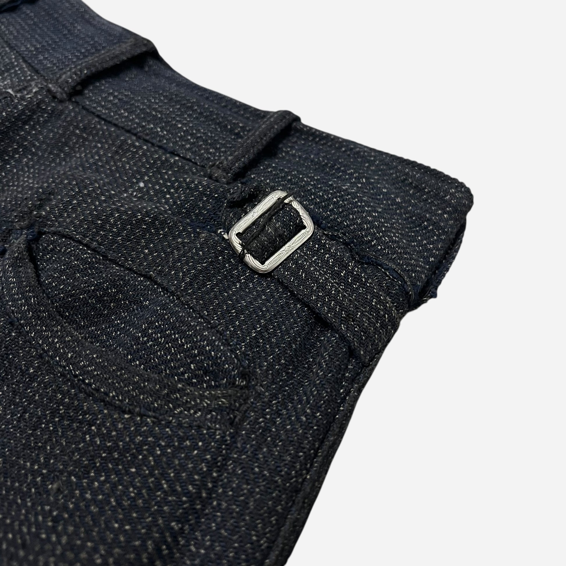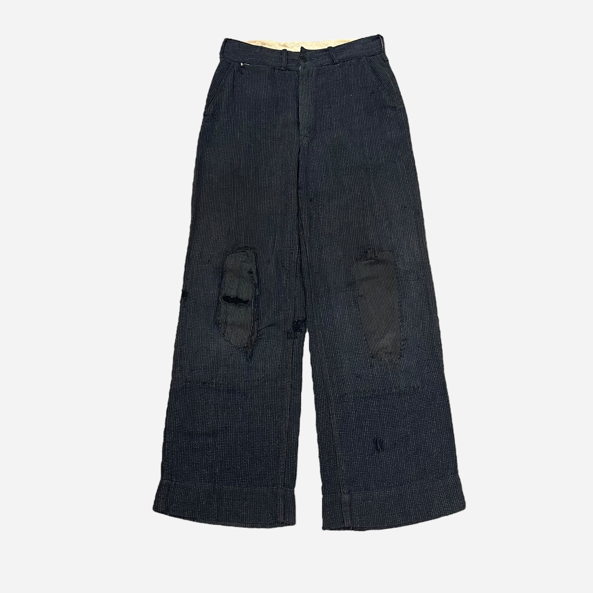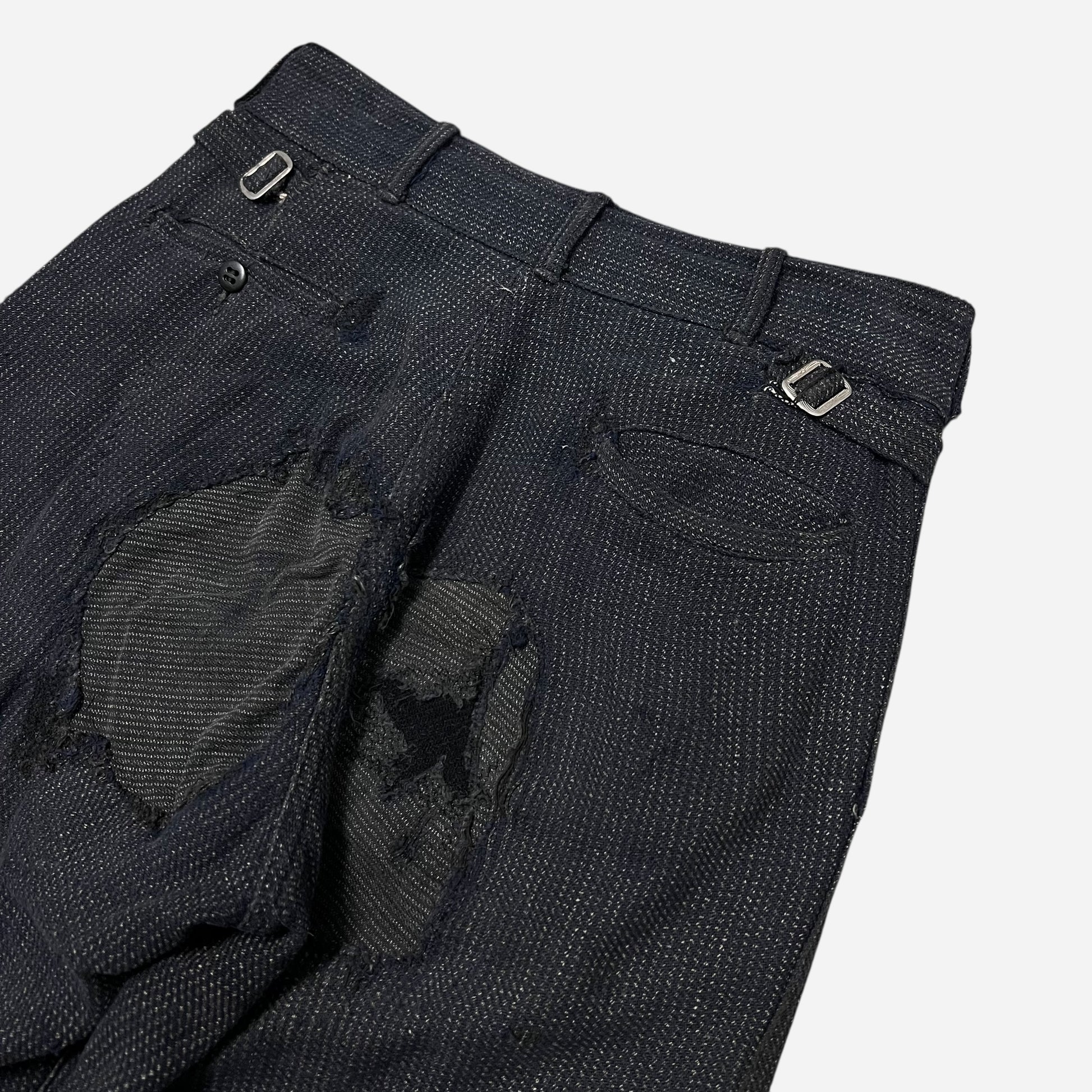 1930s Navy/black side clasp cotton salt & pepper repaired button fly work pants (27w)