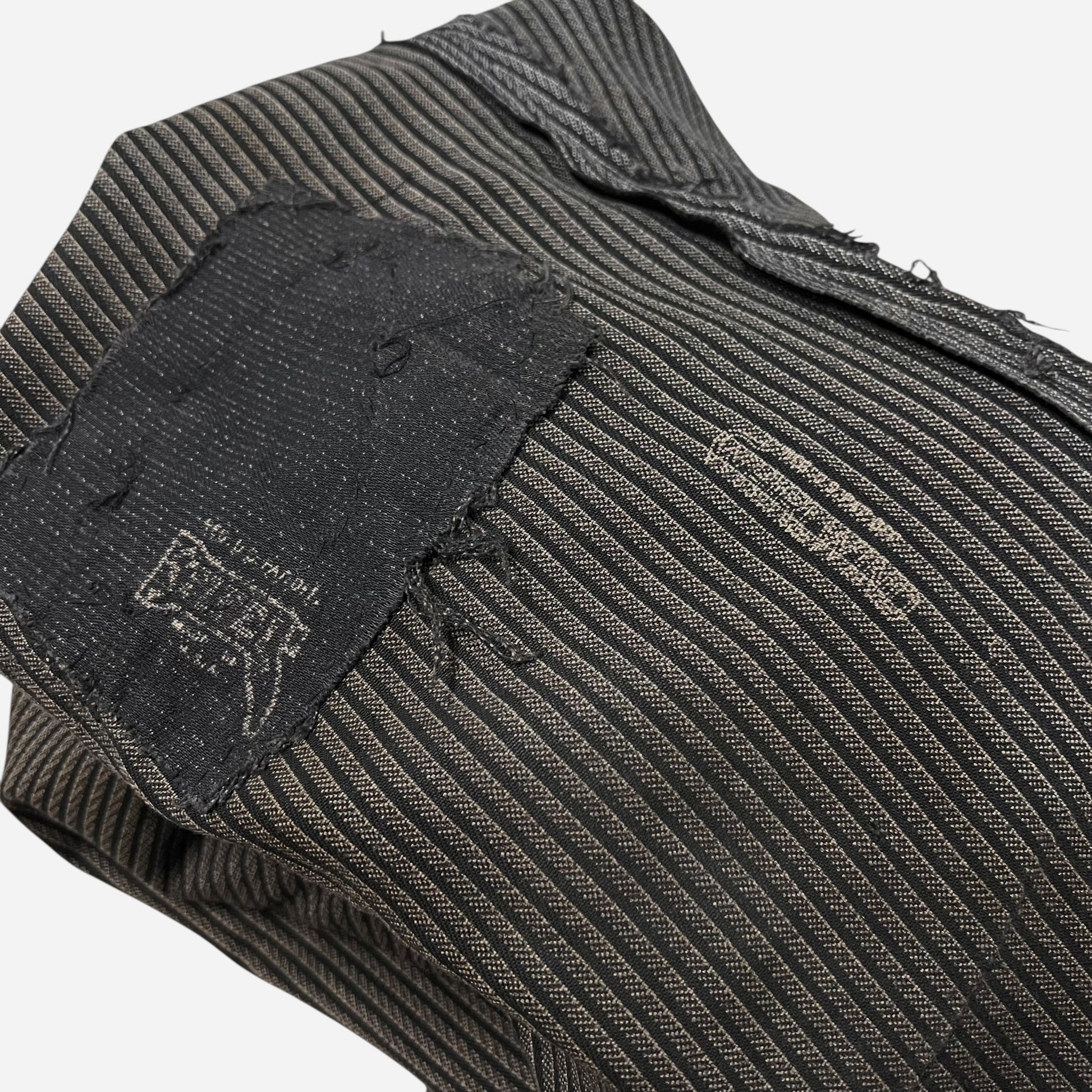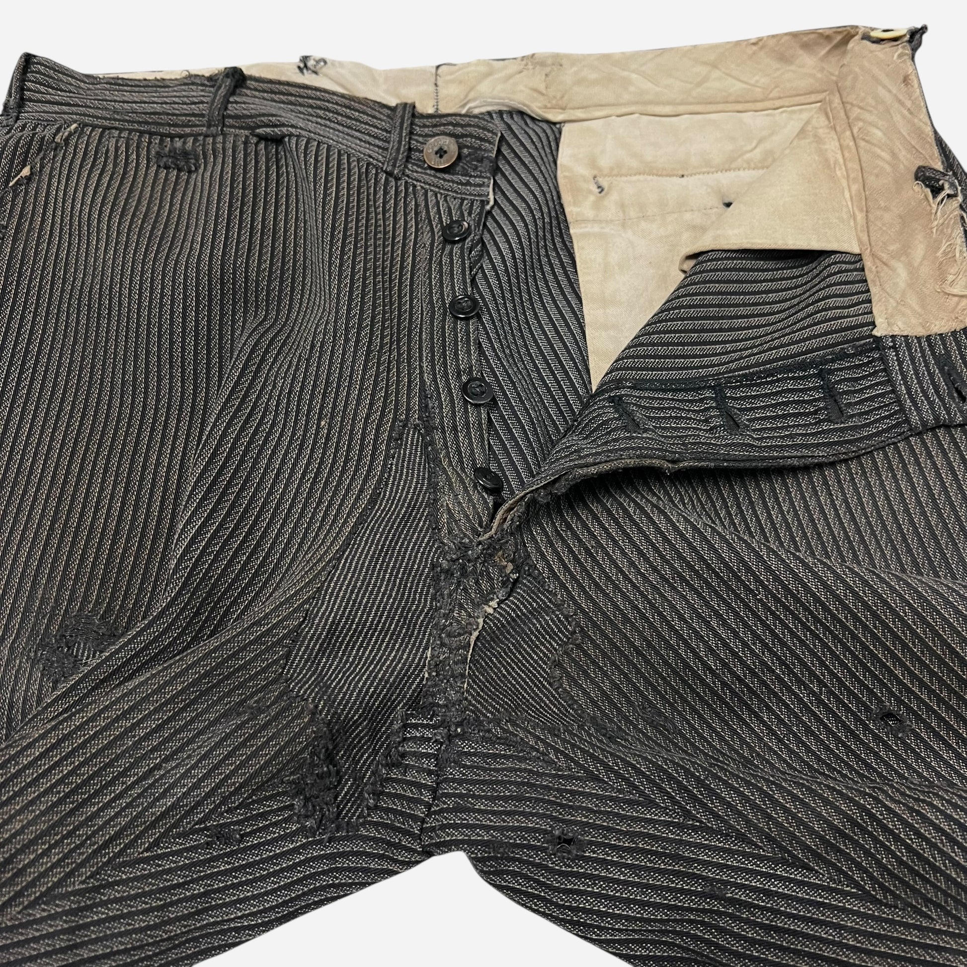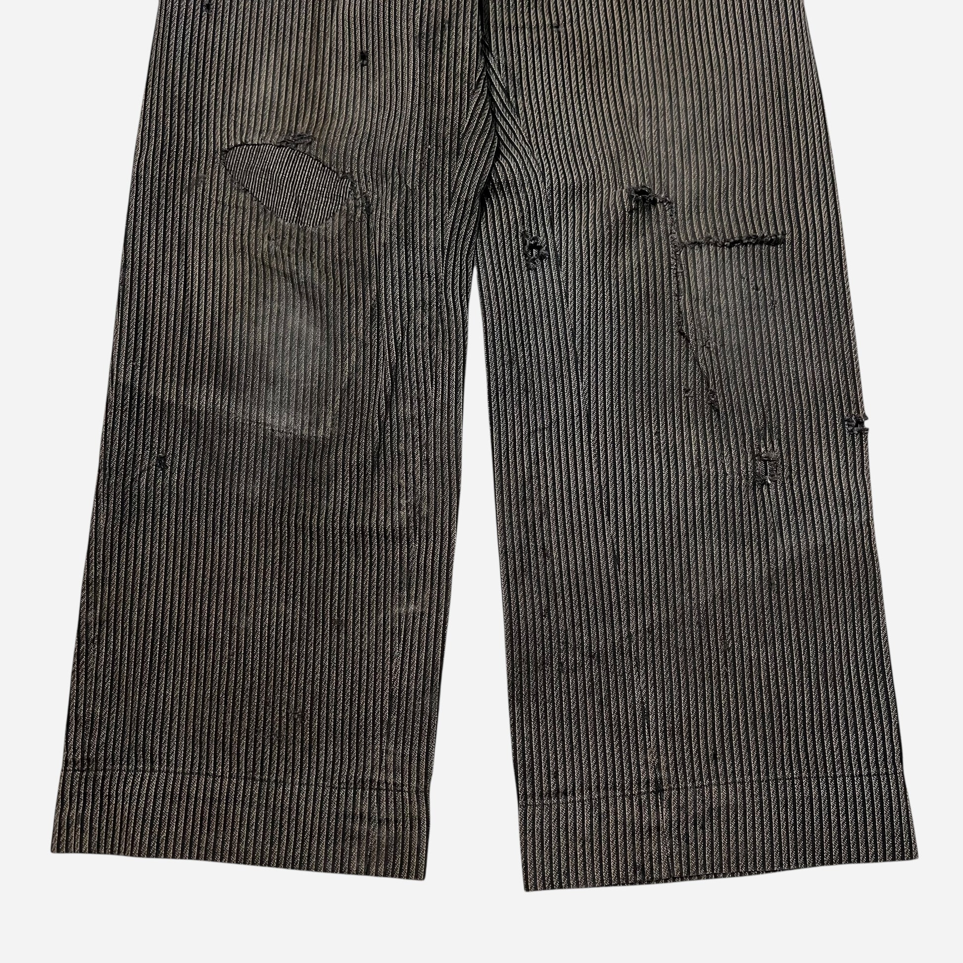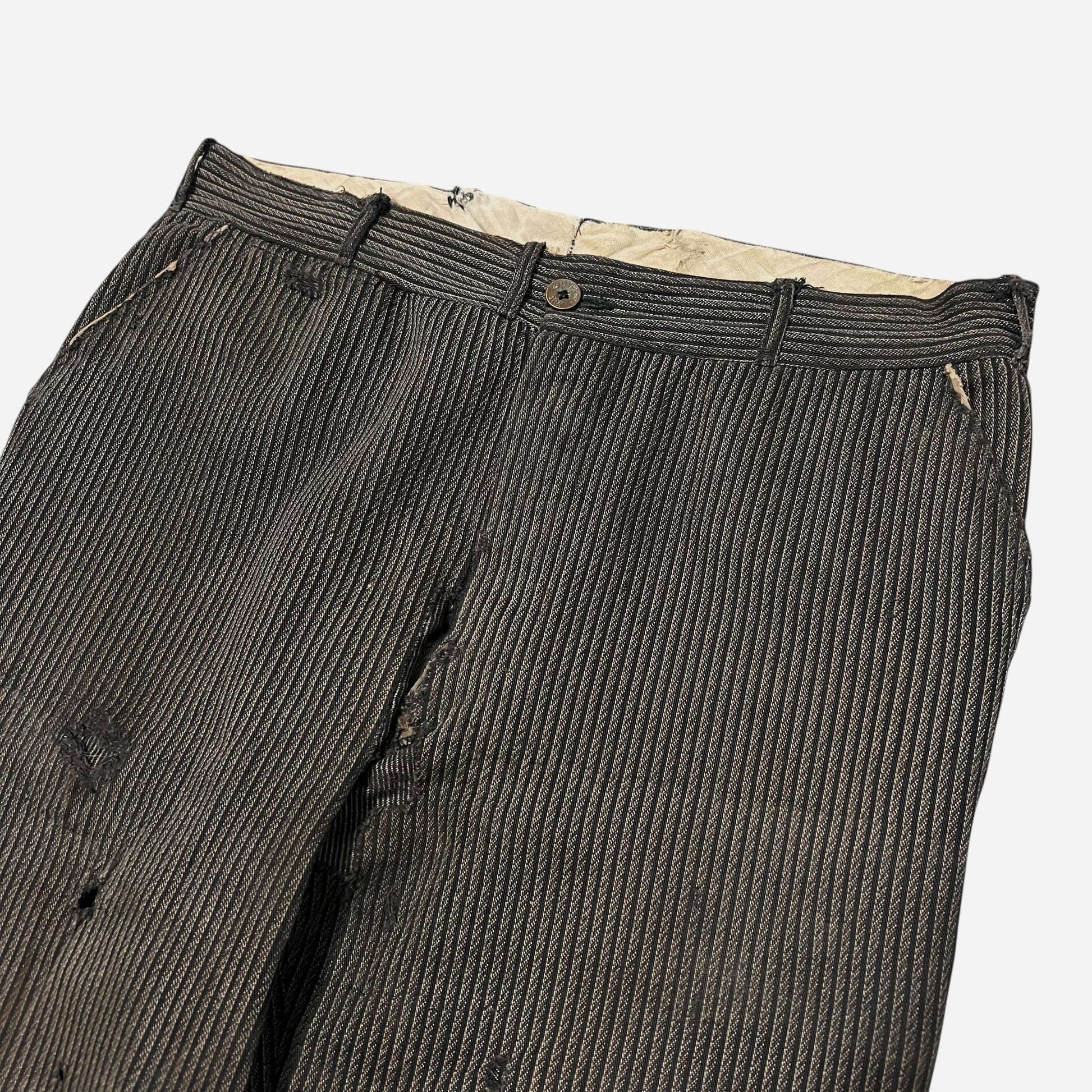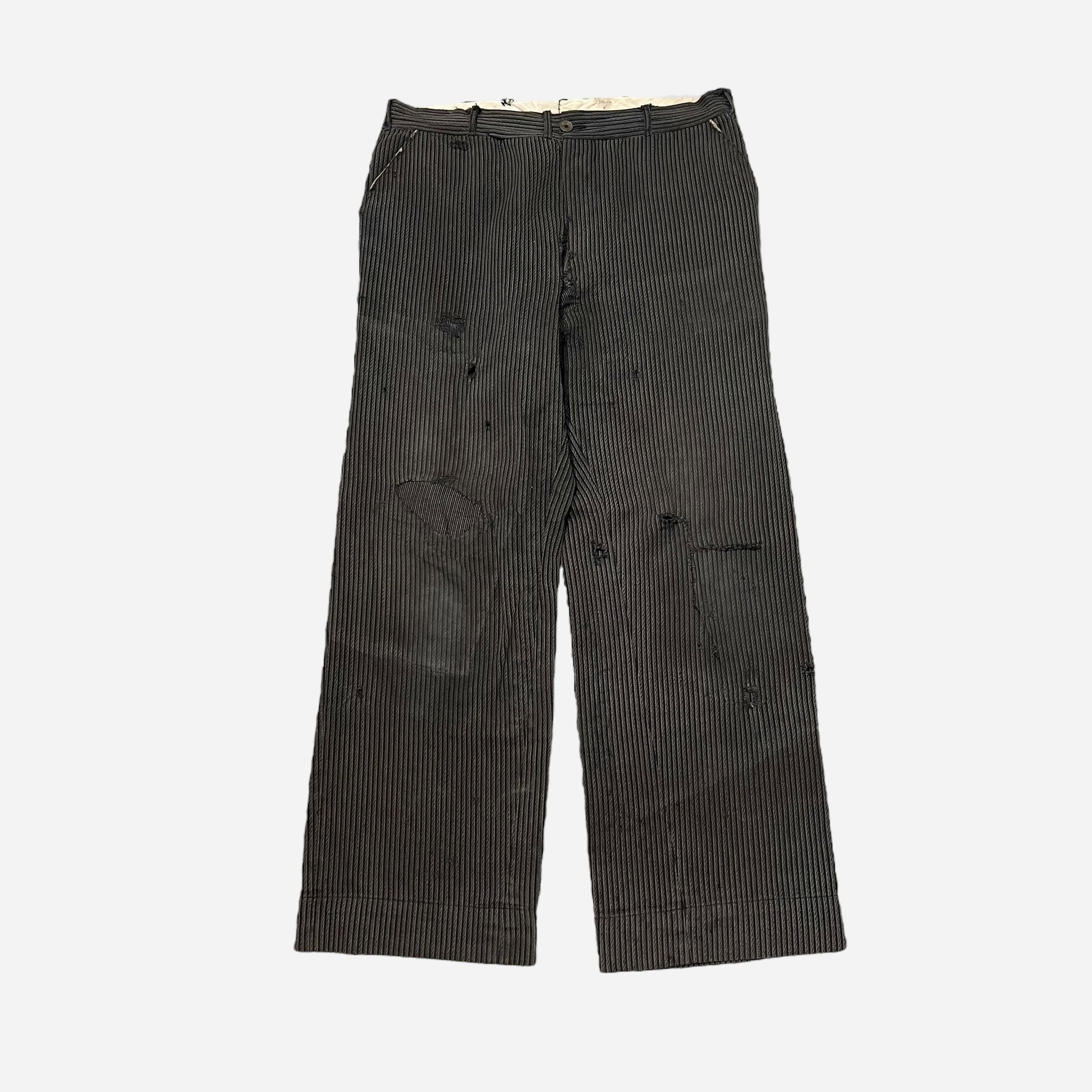 1930s Sweet Orr Stifel Whirlwind striped salt and pepper cotton repaired pants (34w)