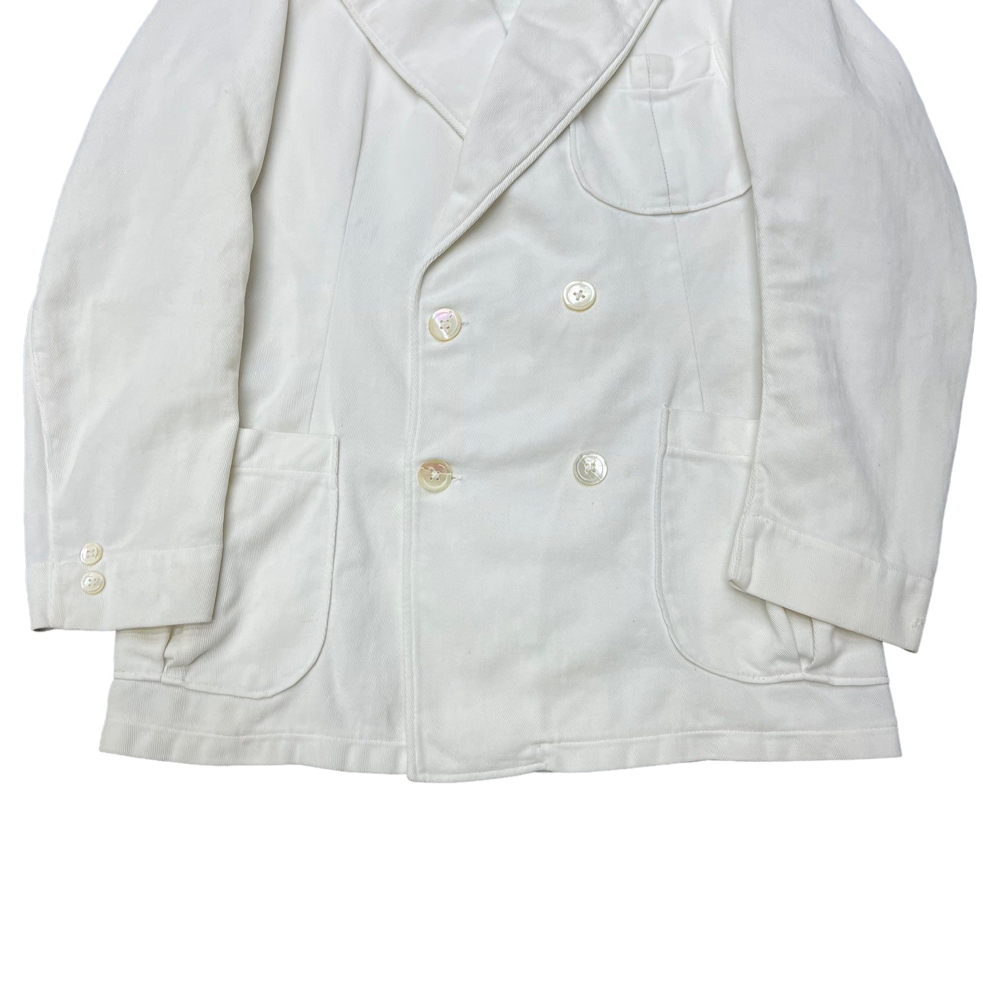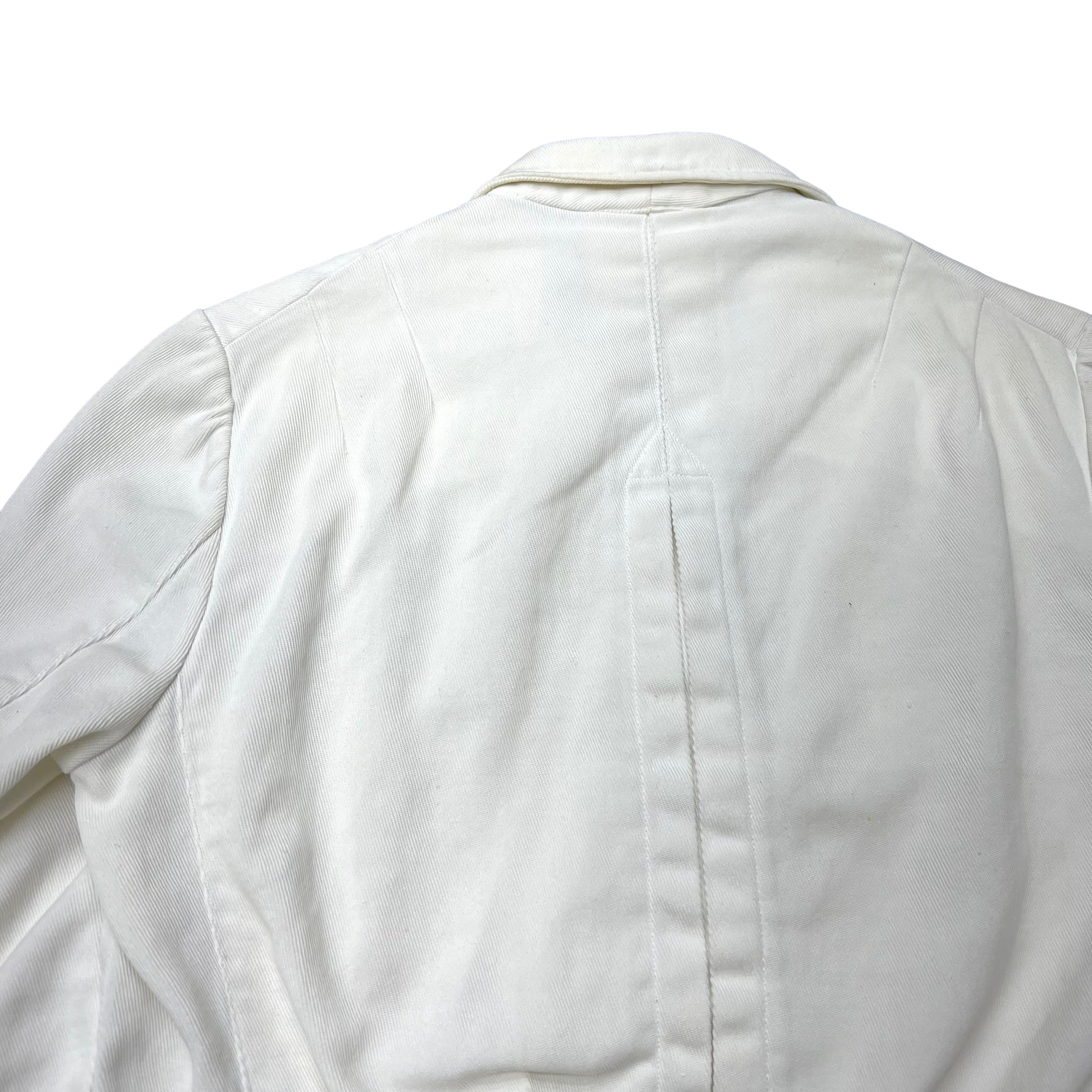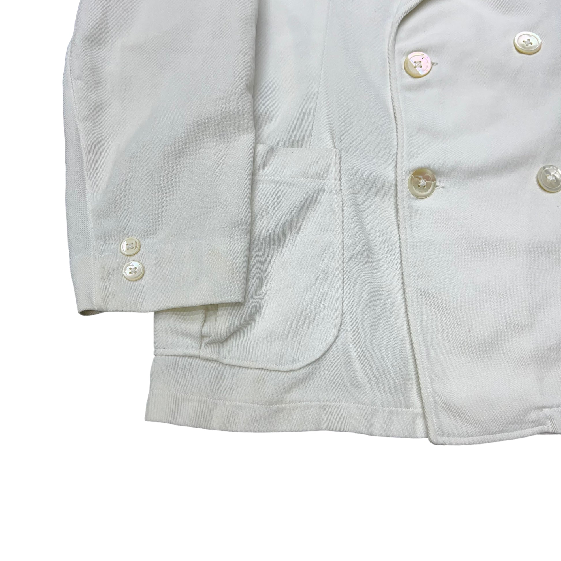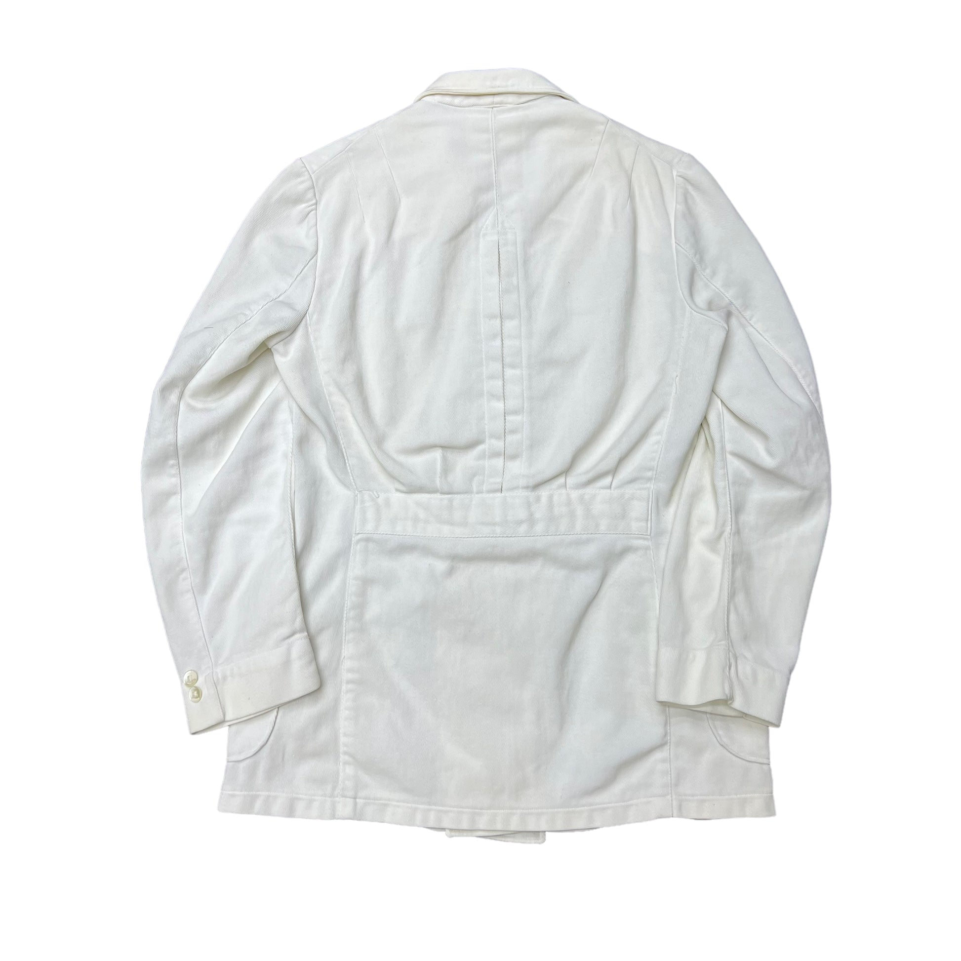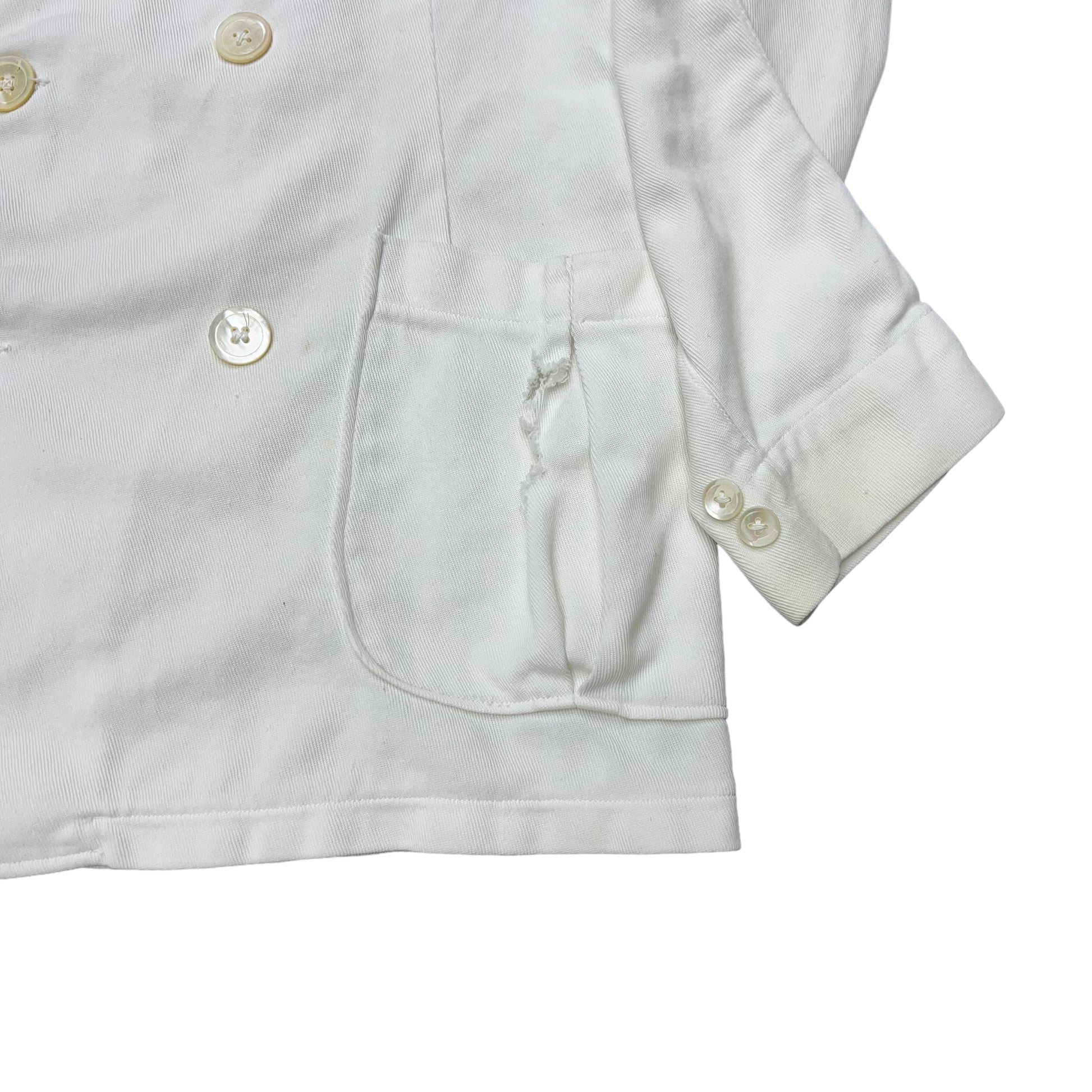 Small blue dye spot on chest, minor yellow staining throughout- unnoticeable and will come out with treatment. Tear on pocket- easy fix.