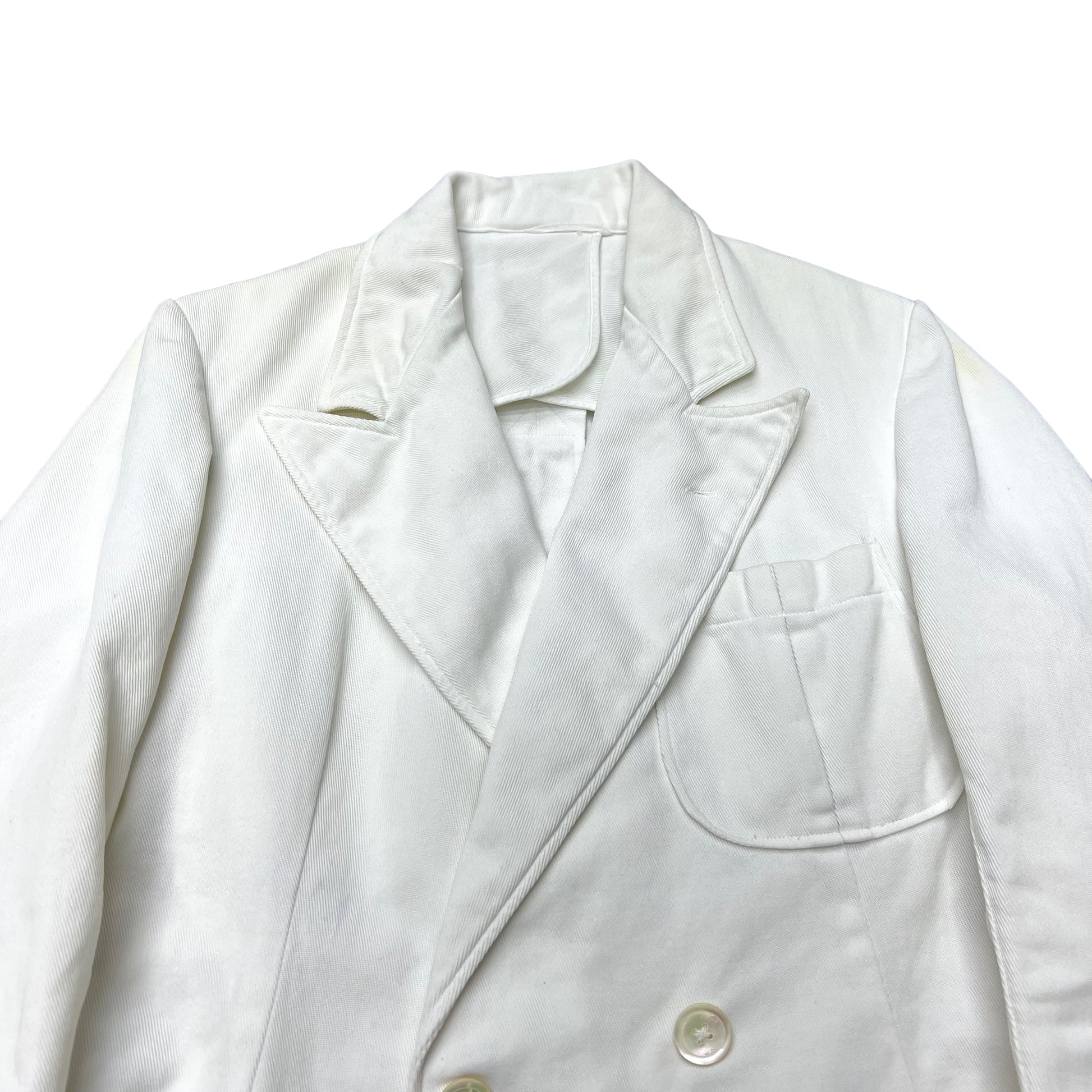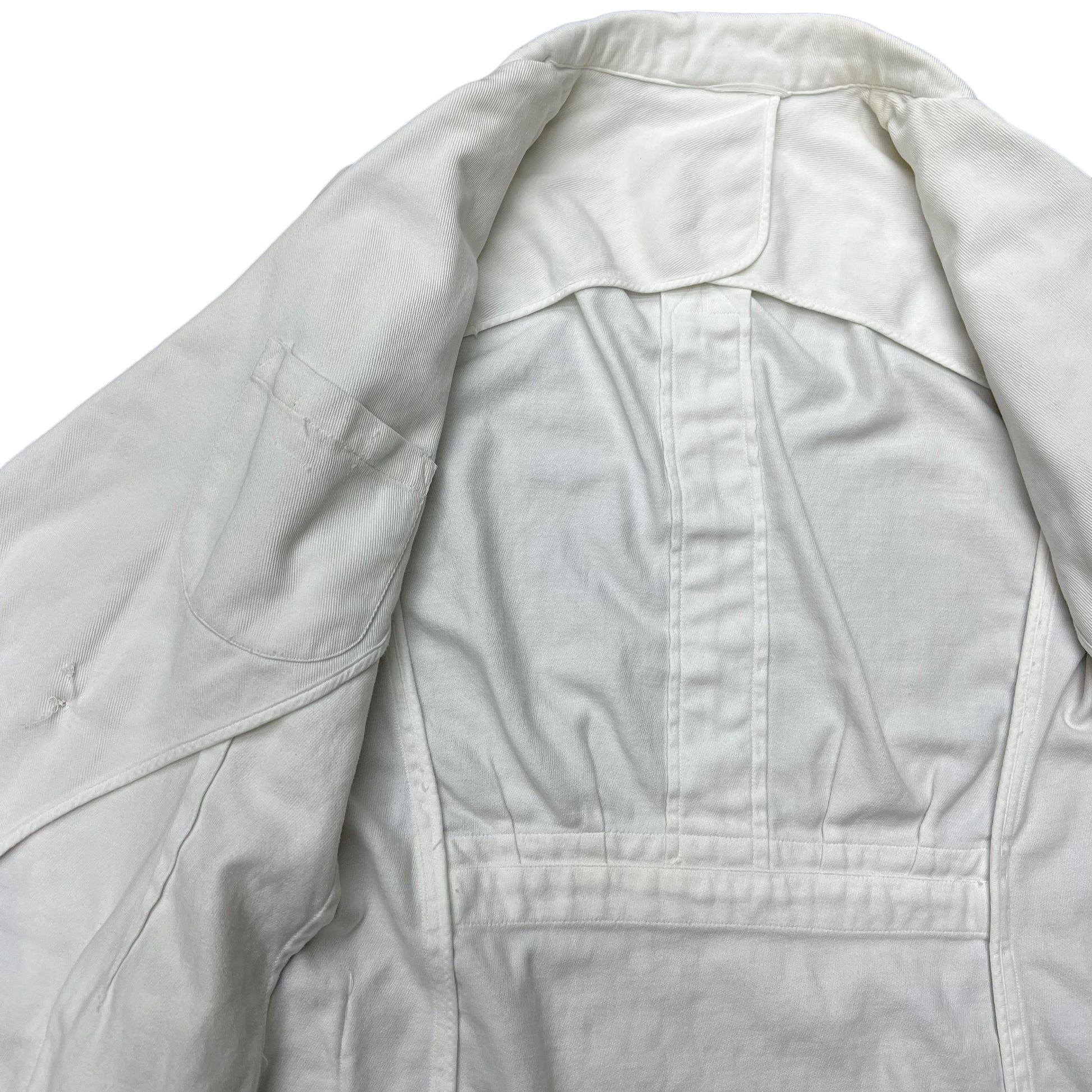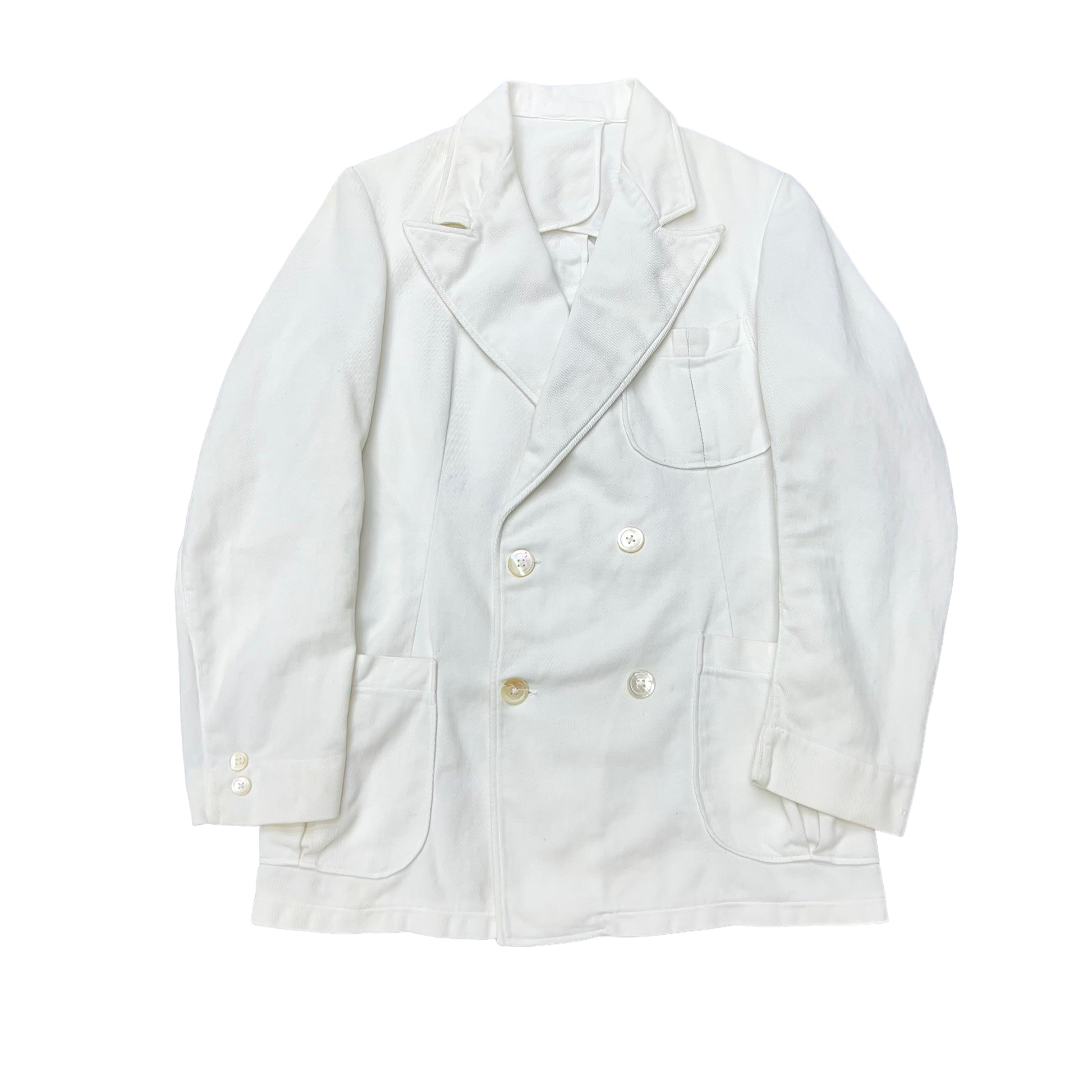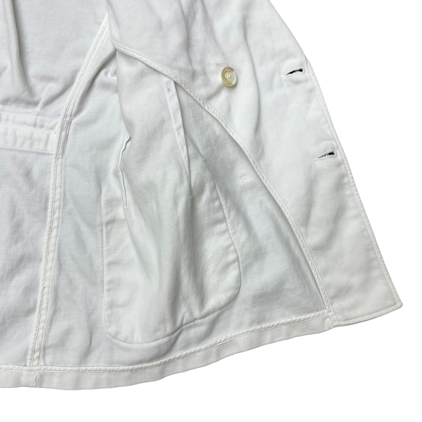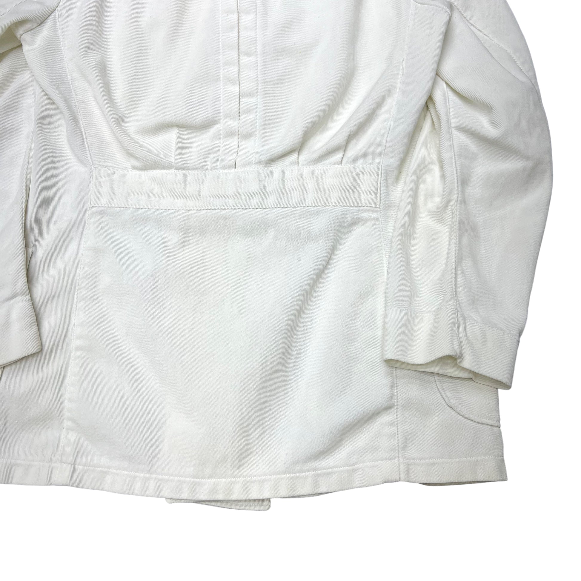 Small blue dye spot on chest, minor yellow staining throughout- unnoticeable and will come out with treatment. Tear on pocket- easy fix.