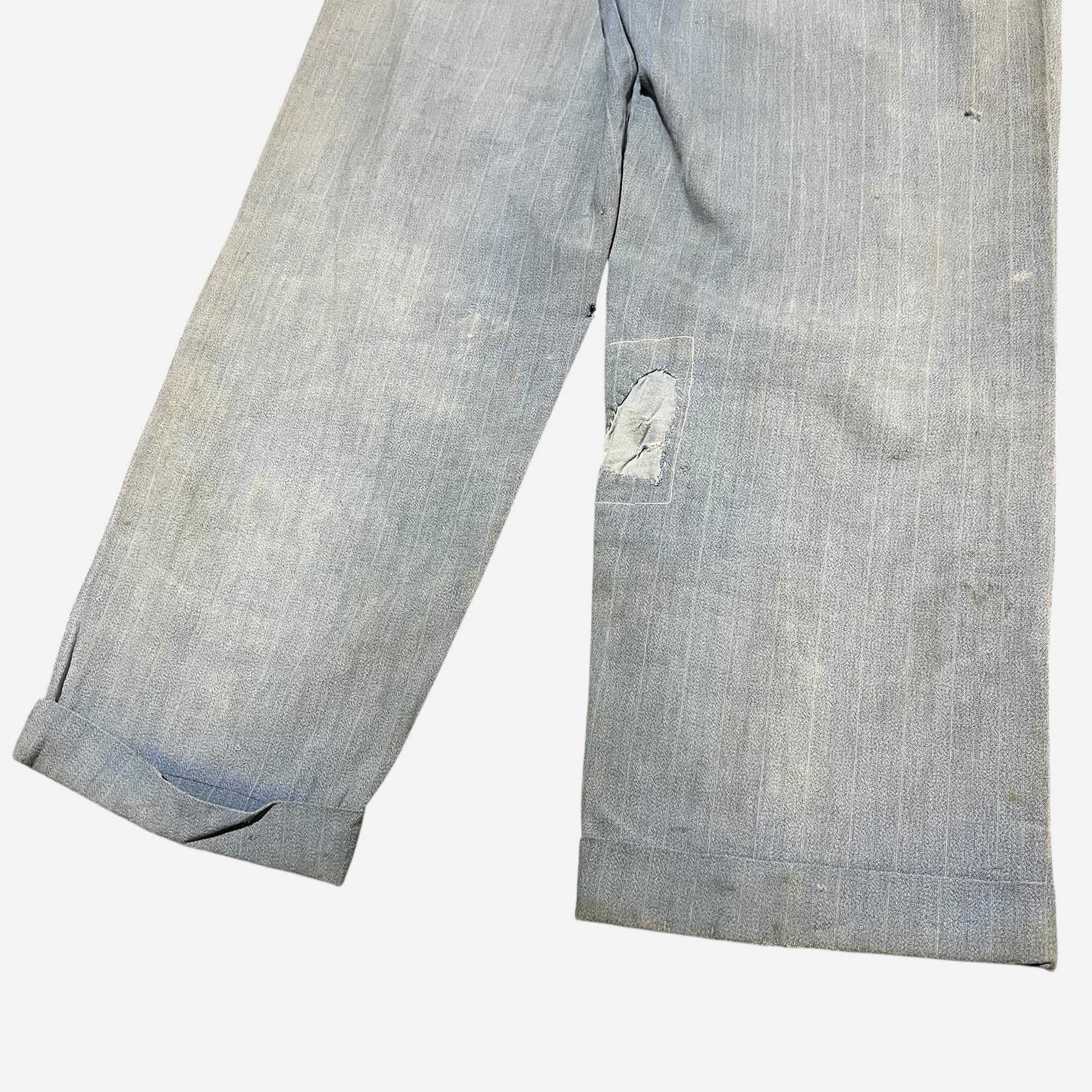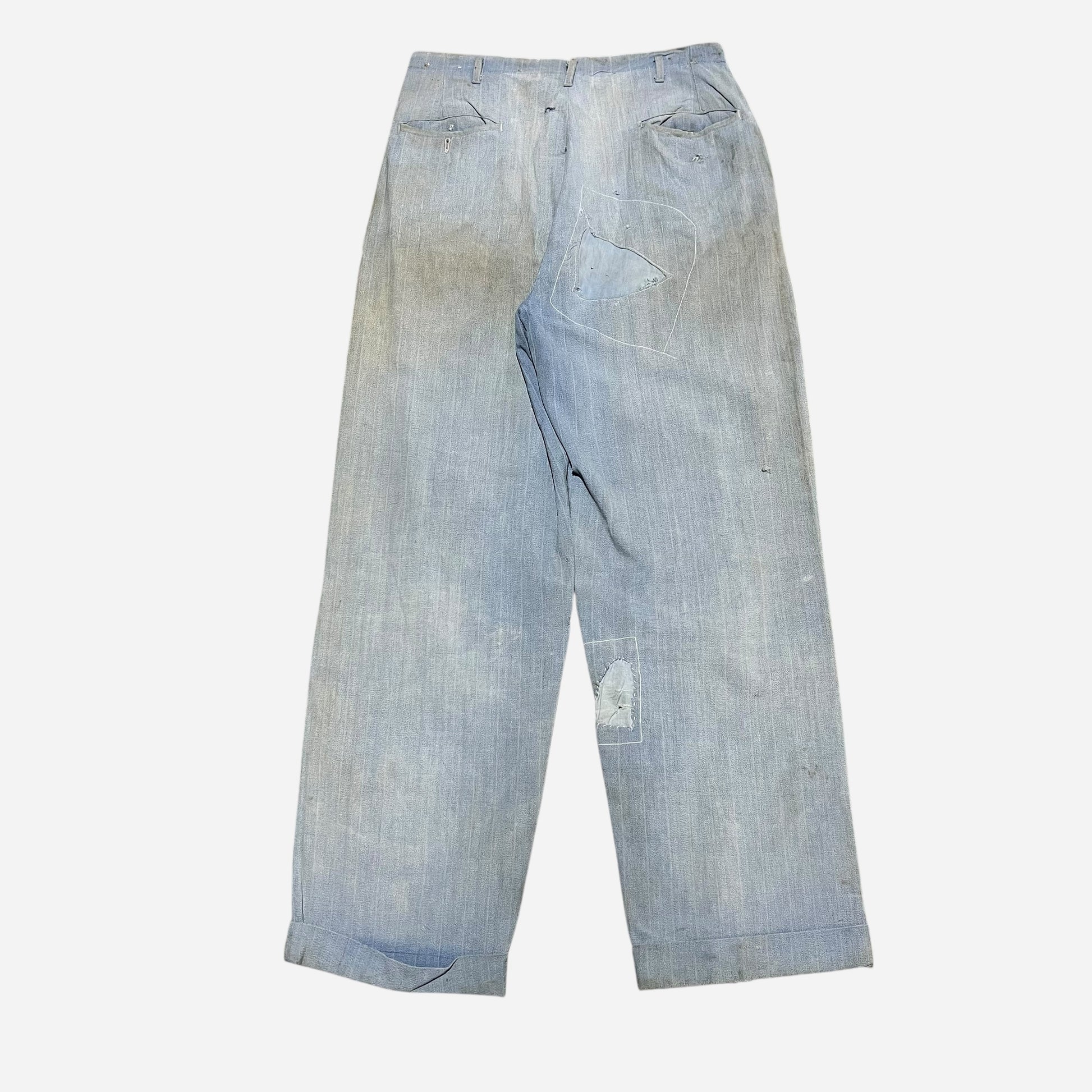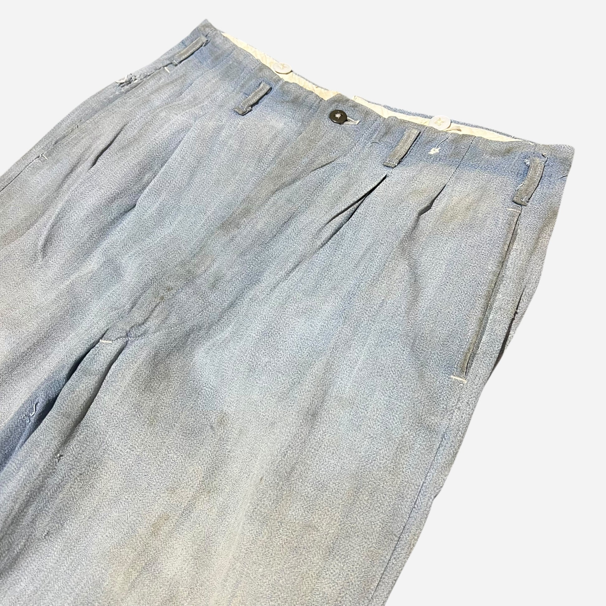 1940s Blue sun faded cotton pleated repaired work pants (30w)