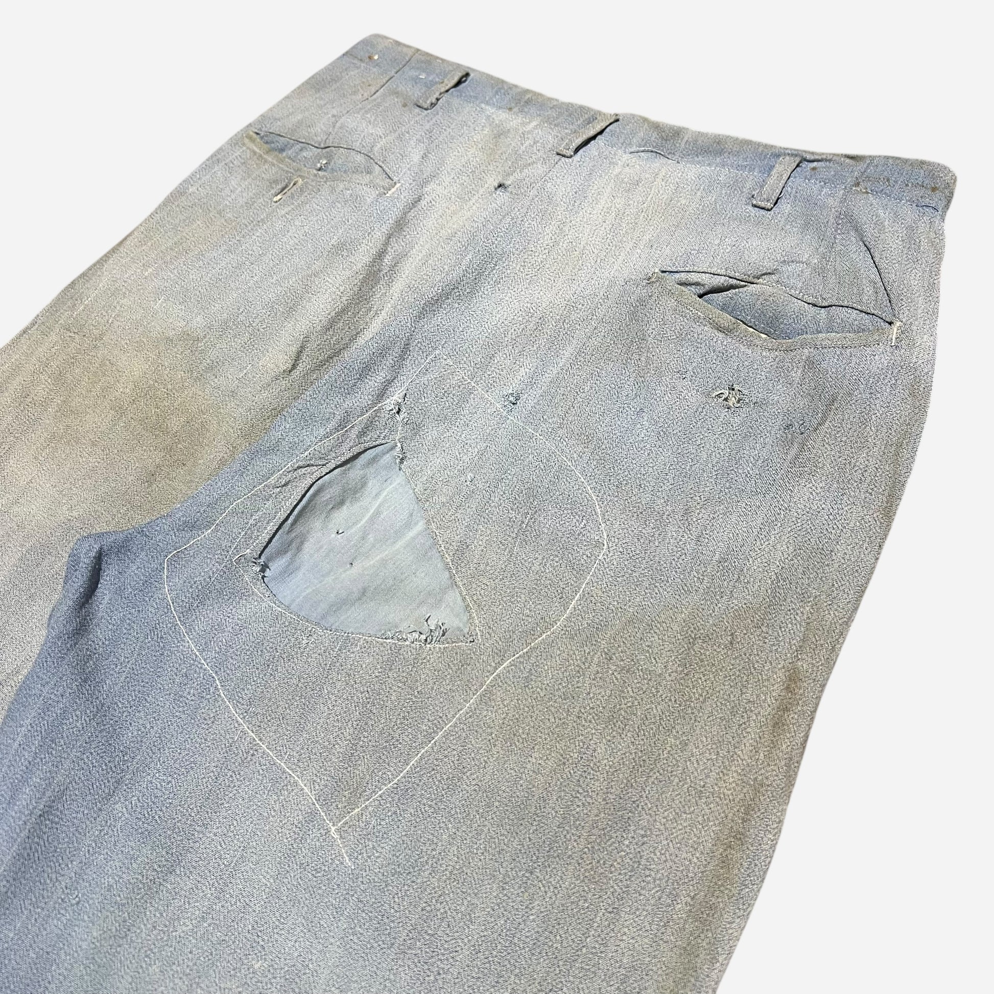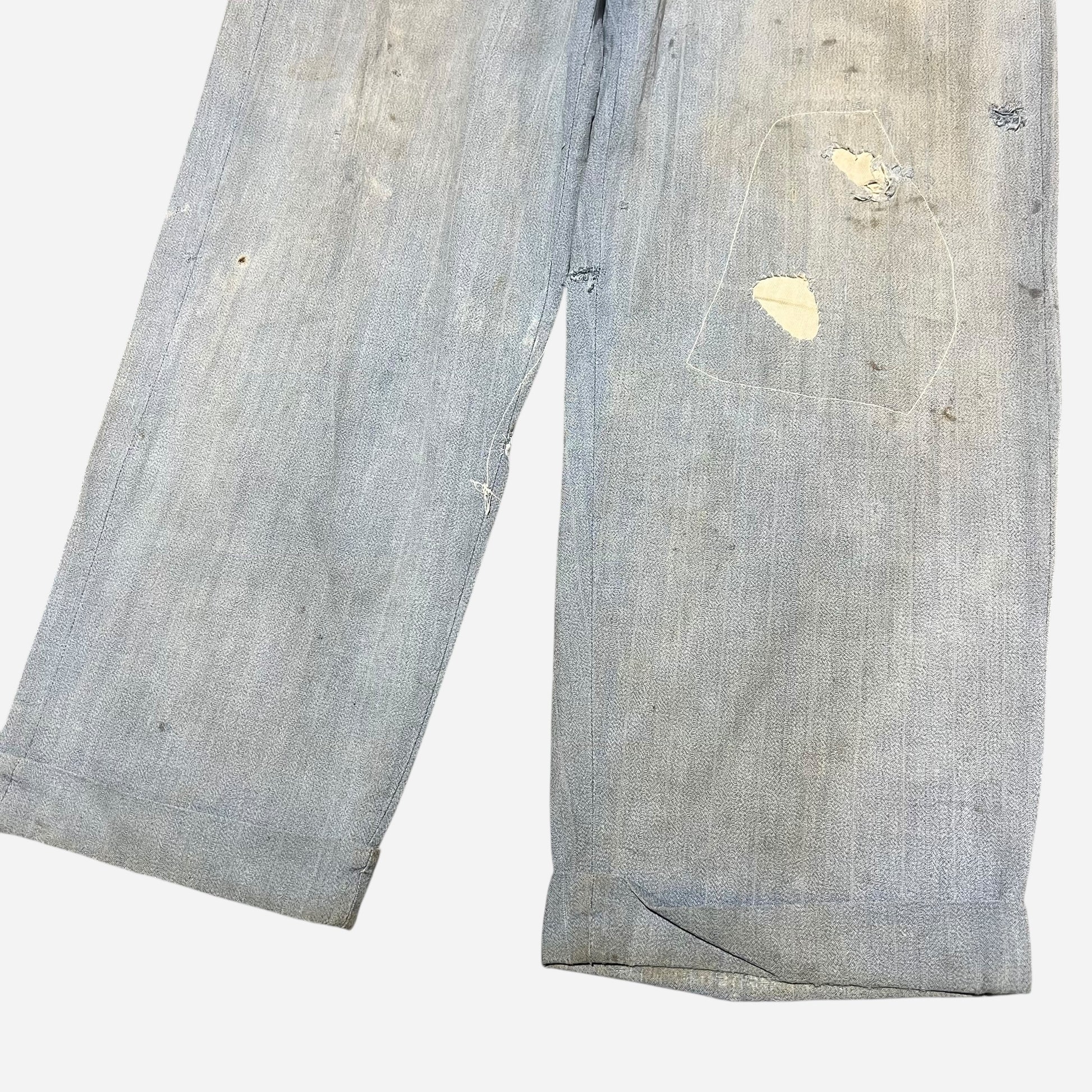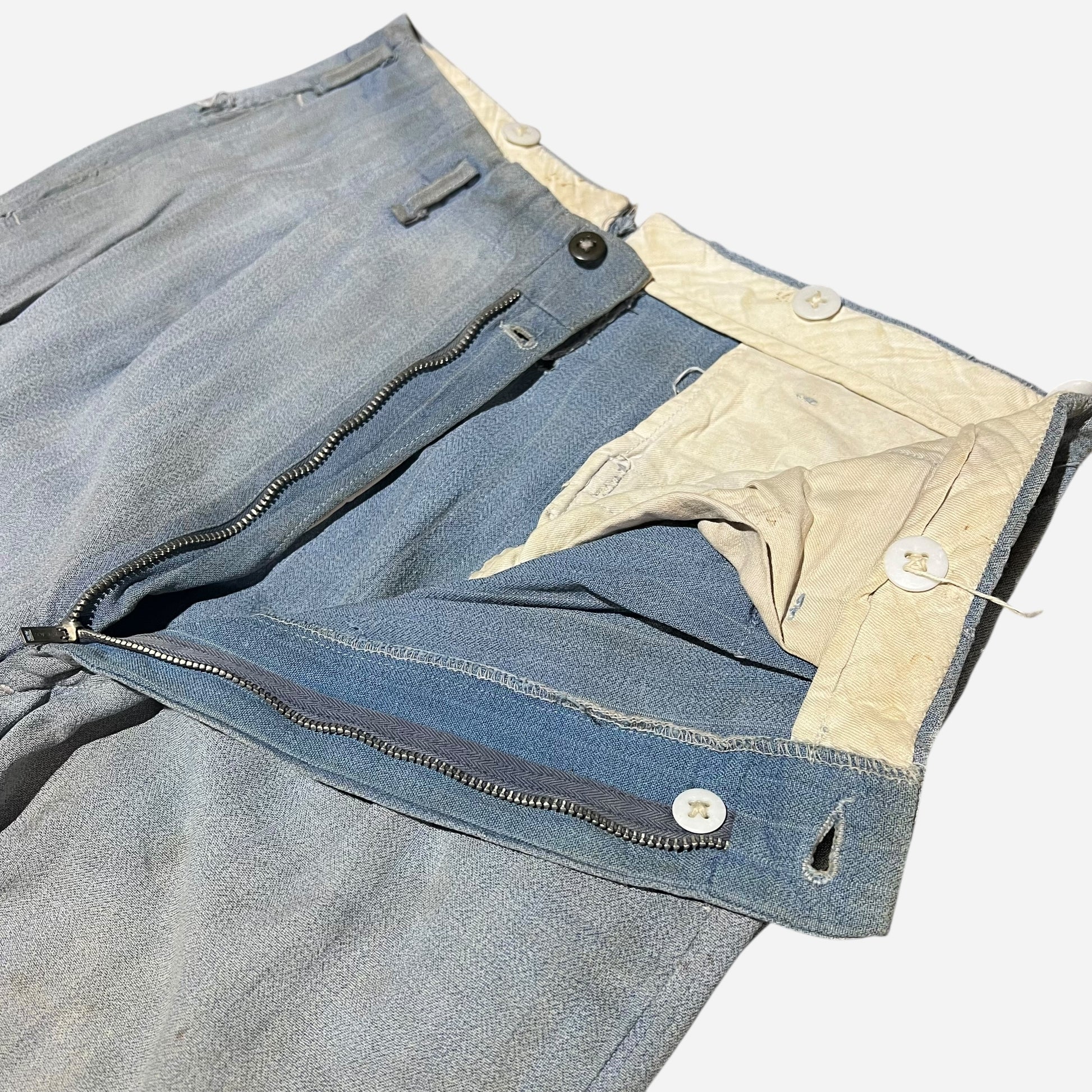 1940s Blue sun faded cotton pleated repaired work pants (30w)