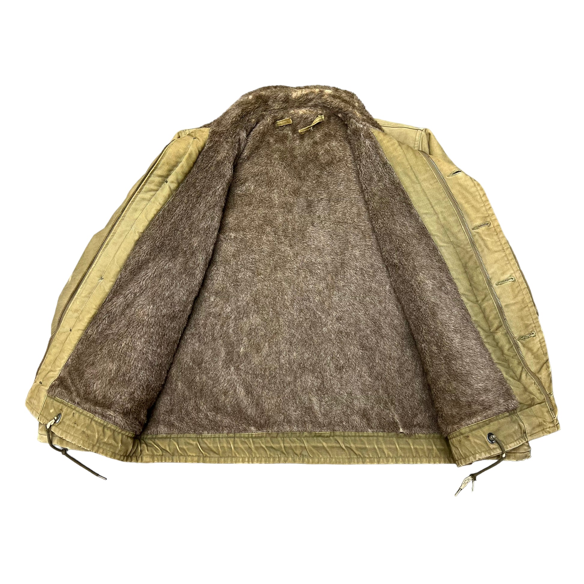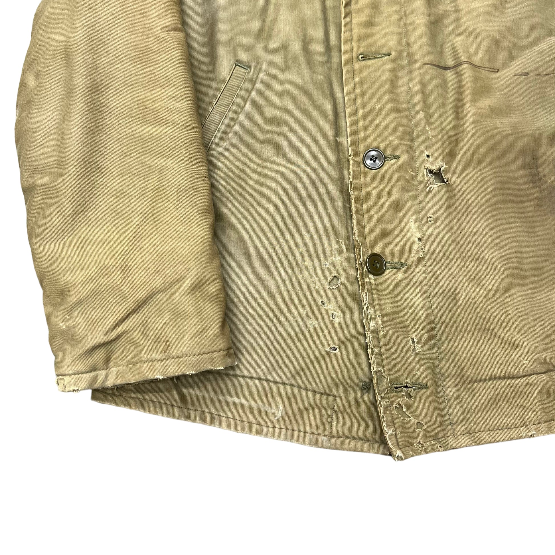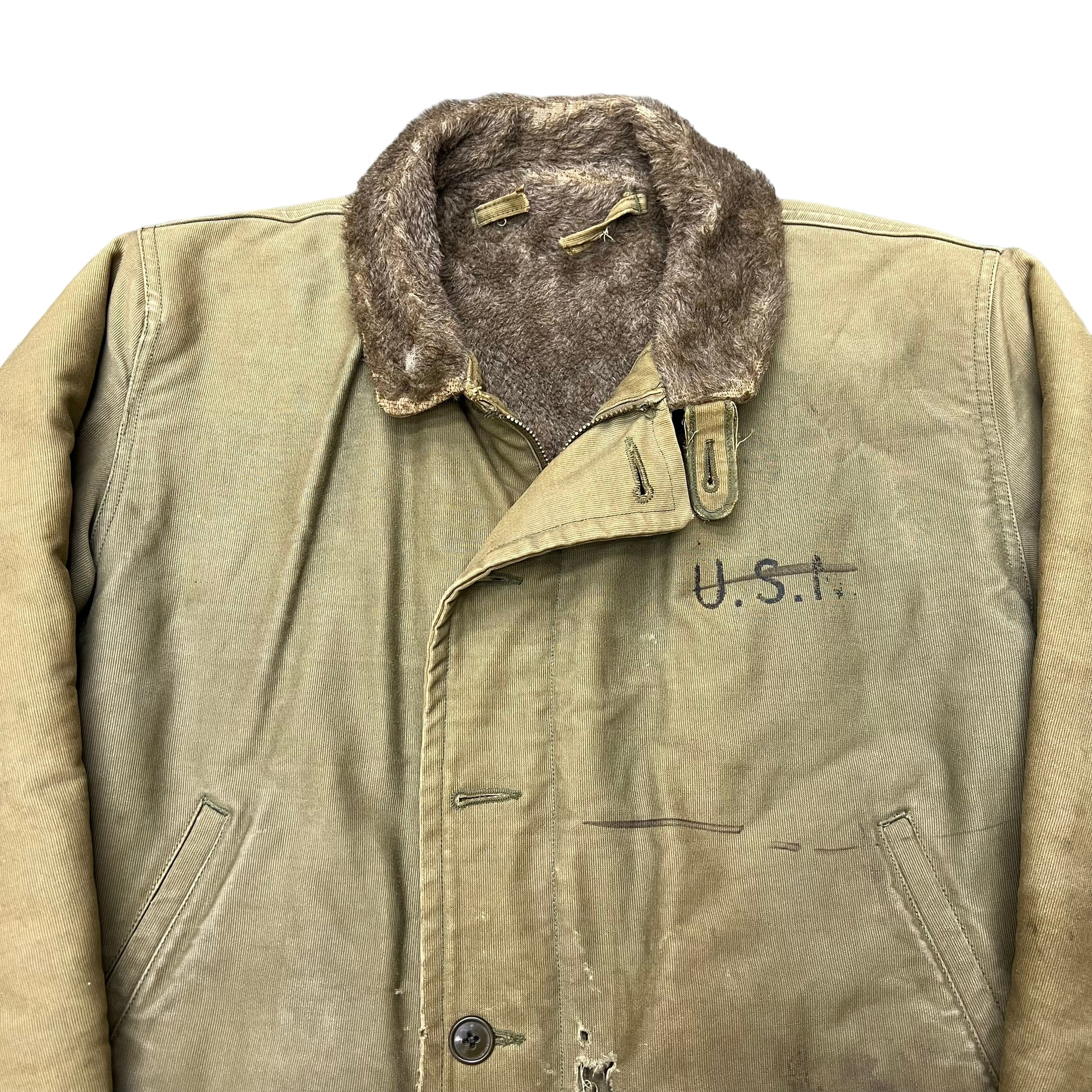 Missing zipper pull. Has two buttons. Liner is in excellent shape, just some collar wear. Sleeve cuffs are in good shape.