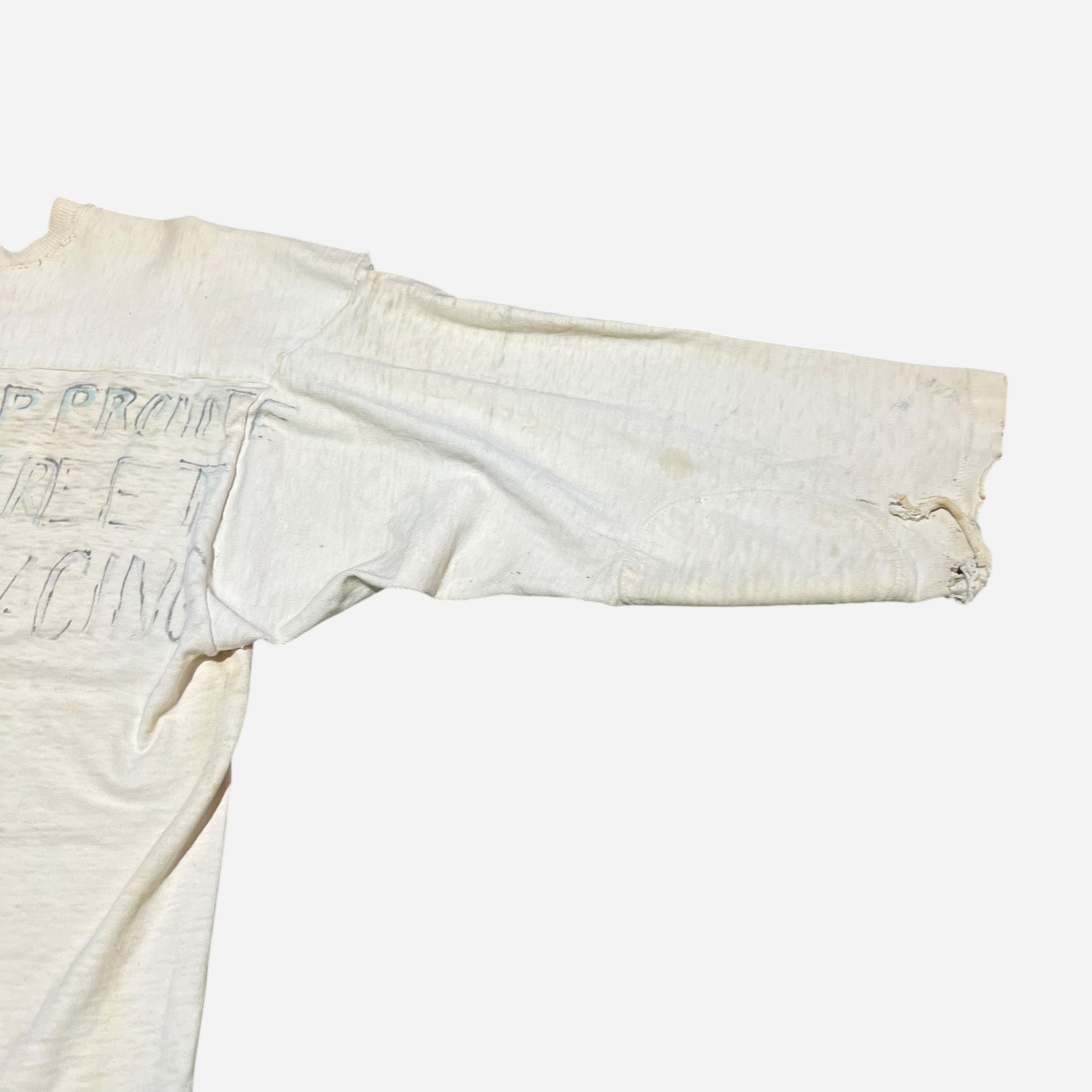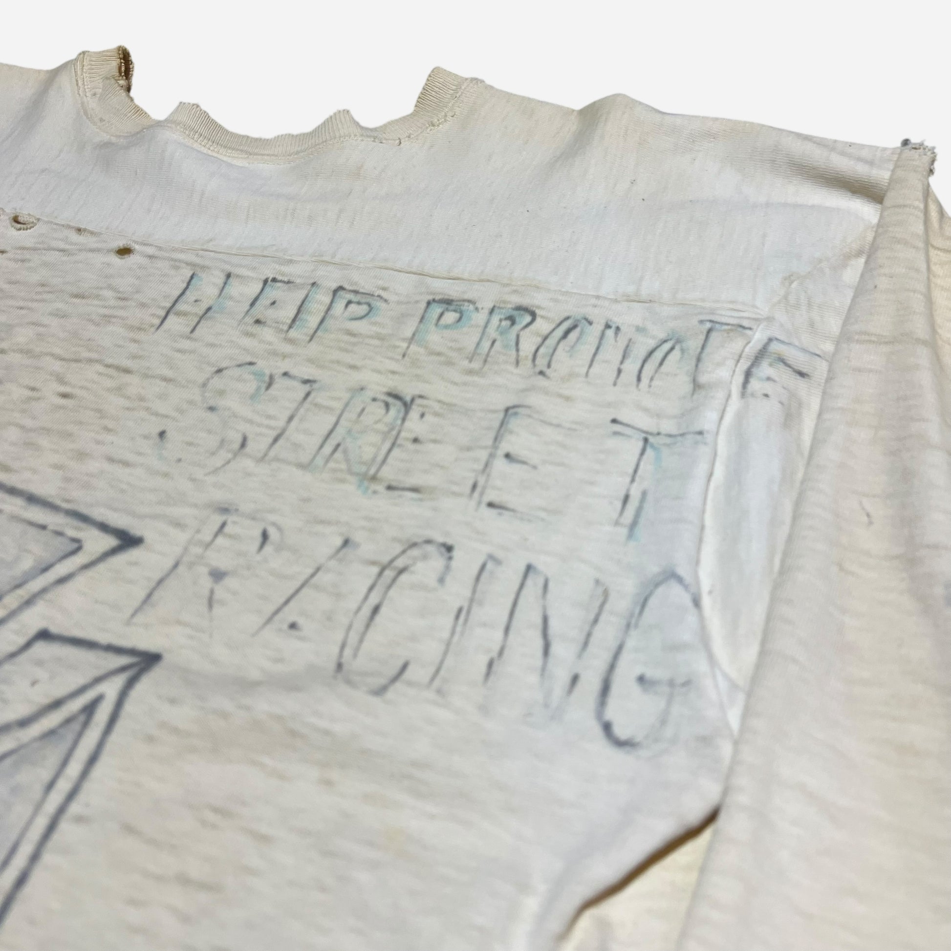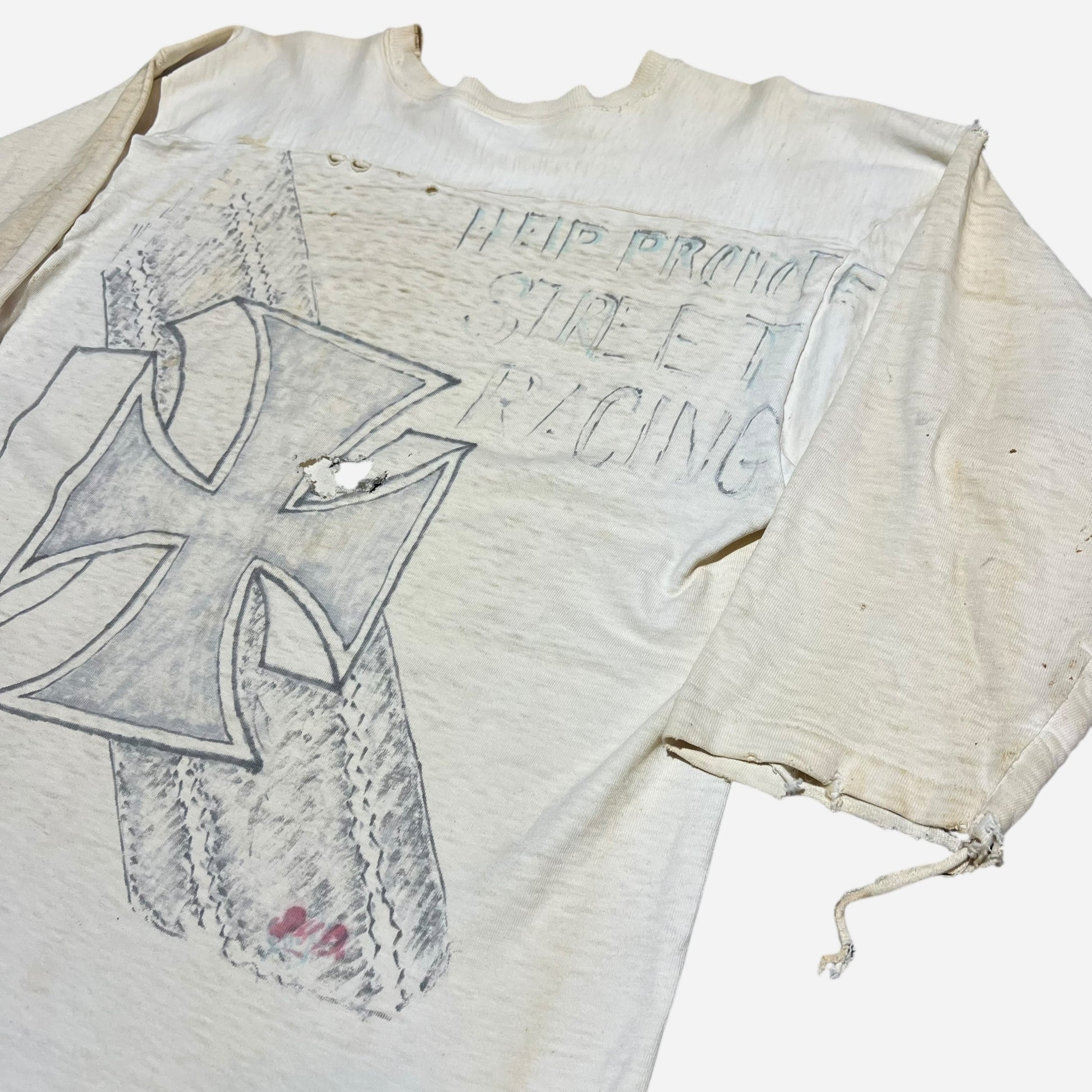1960s Hanes thrashed hand drawn “Help Protect Street Racing” white cotton jersey shirt (L)